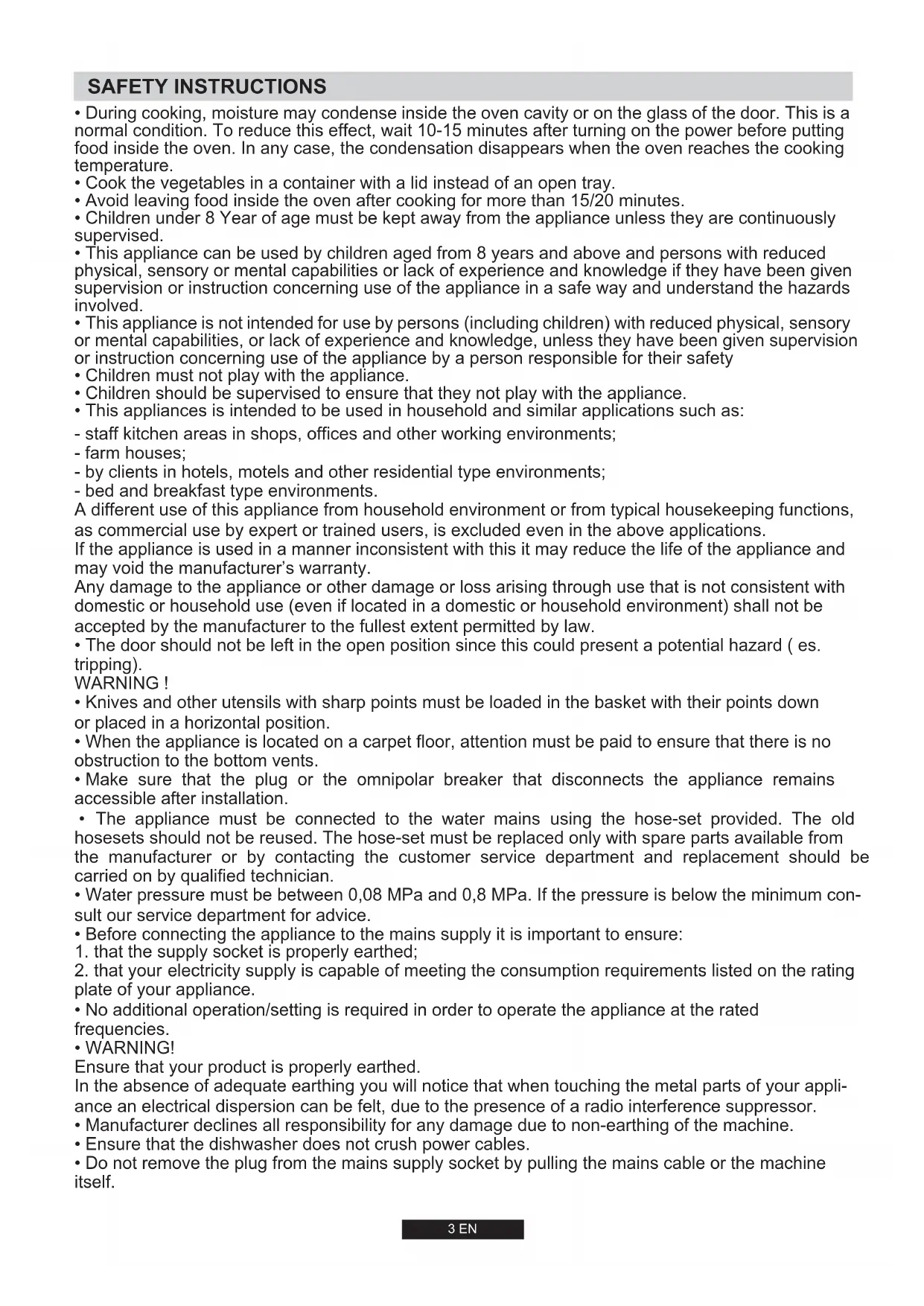 - Only use the oven for its intended purpose, that is only for the cooking of foods: any other use, for example as a heat source, is considered improper and therefore dangerous. The manufacturer cannot be held responsible for any damage resulting from improper, incorrect or unreasonable usage.