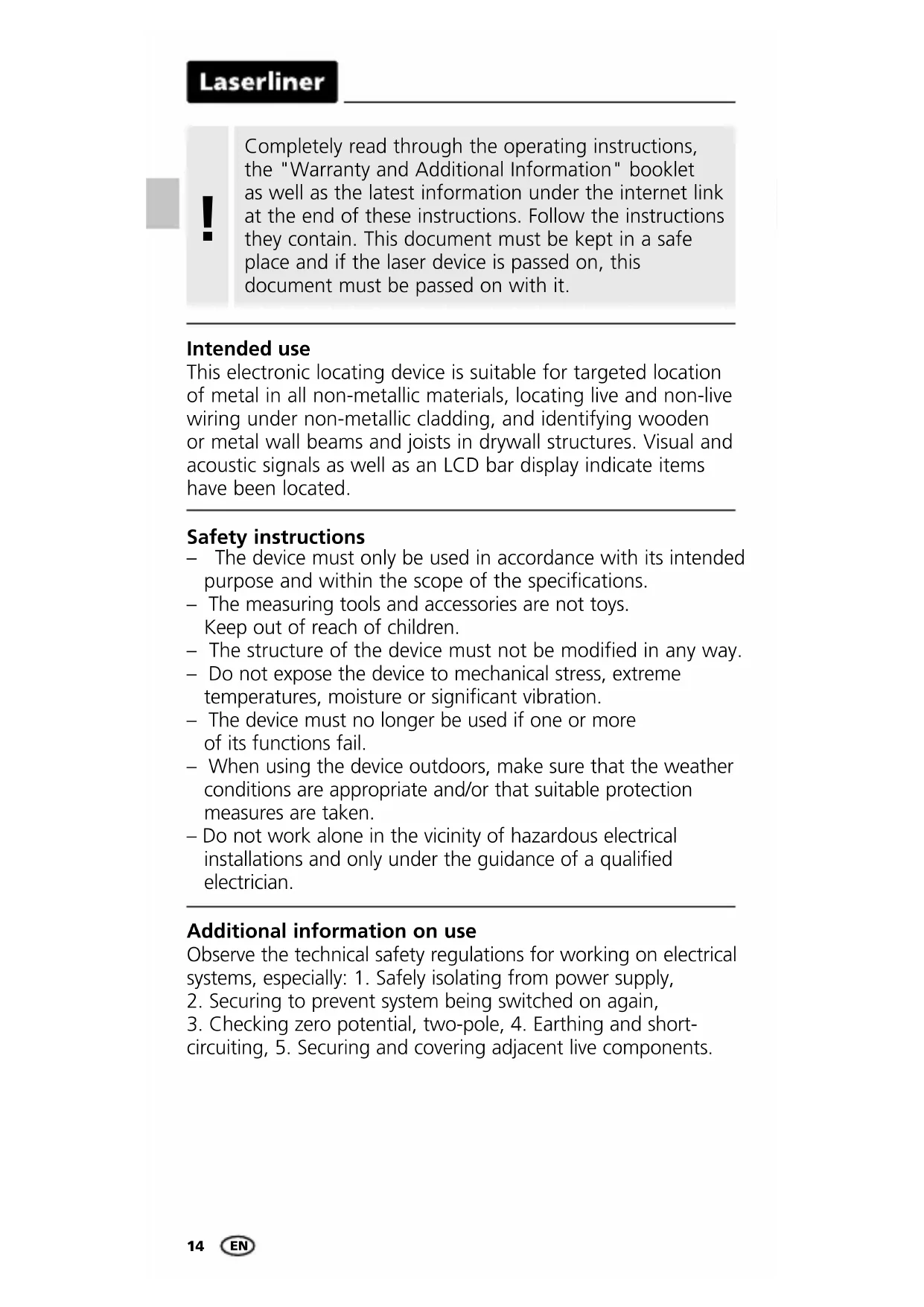 circuiting, 5. Securing and covering adjacent live components. This electronic locating device is suitable for targeted location of metal in all non-metallic materials, locating live and non-live wiring under non-metallic cladding, and identifying wooden or metal wall beams and joists in drywall structures. Visual and acoustic signals as well as an LCD bar display indicate items have been located. Intended use Completely read through the operating instructions, the "Warranty and Additional Information" booklet as well as the latest information under the internet link at the end of these instructions. Follow the instructions they contain. This document must be kept in a safe place and if the laser device is passed on, this document must be passed on with it.