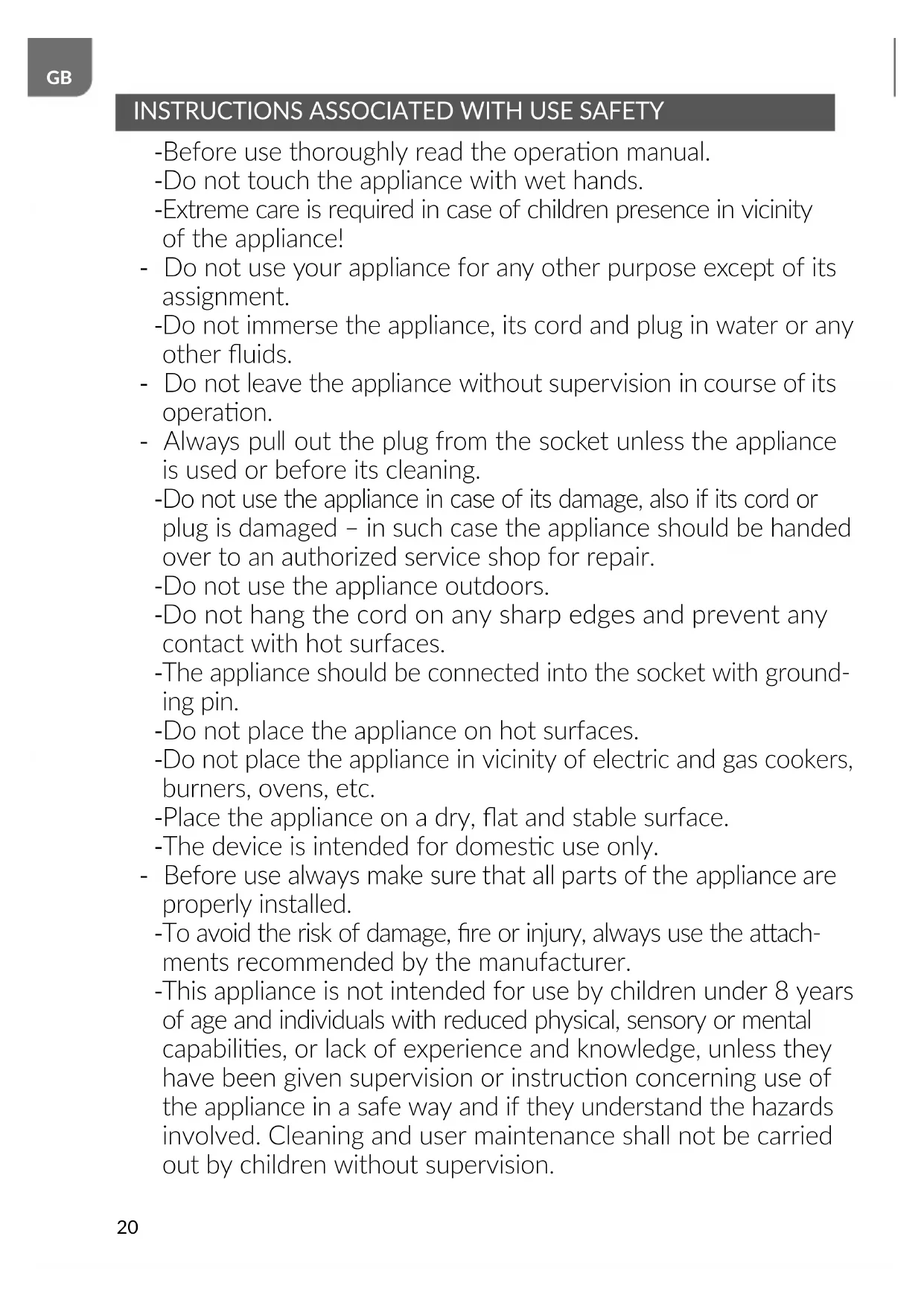 Do not use the appliance in case of its damage, also if its cord or plug is damaged – in such case the appliance should be handed over to an authorized service shop for repair. - Do not use the appliance outdoors.
