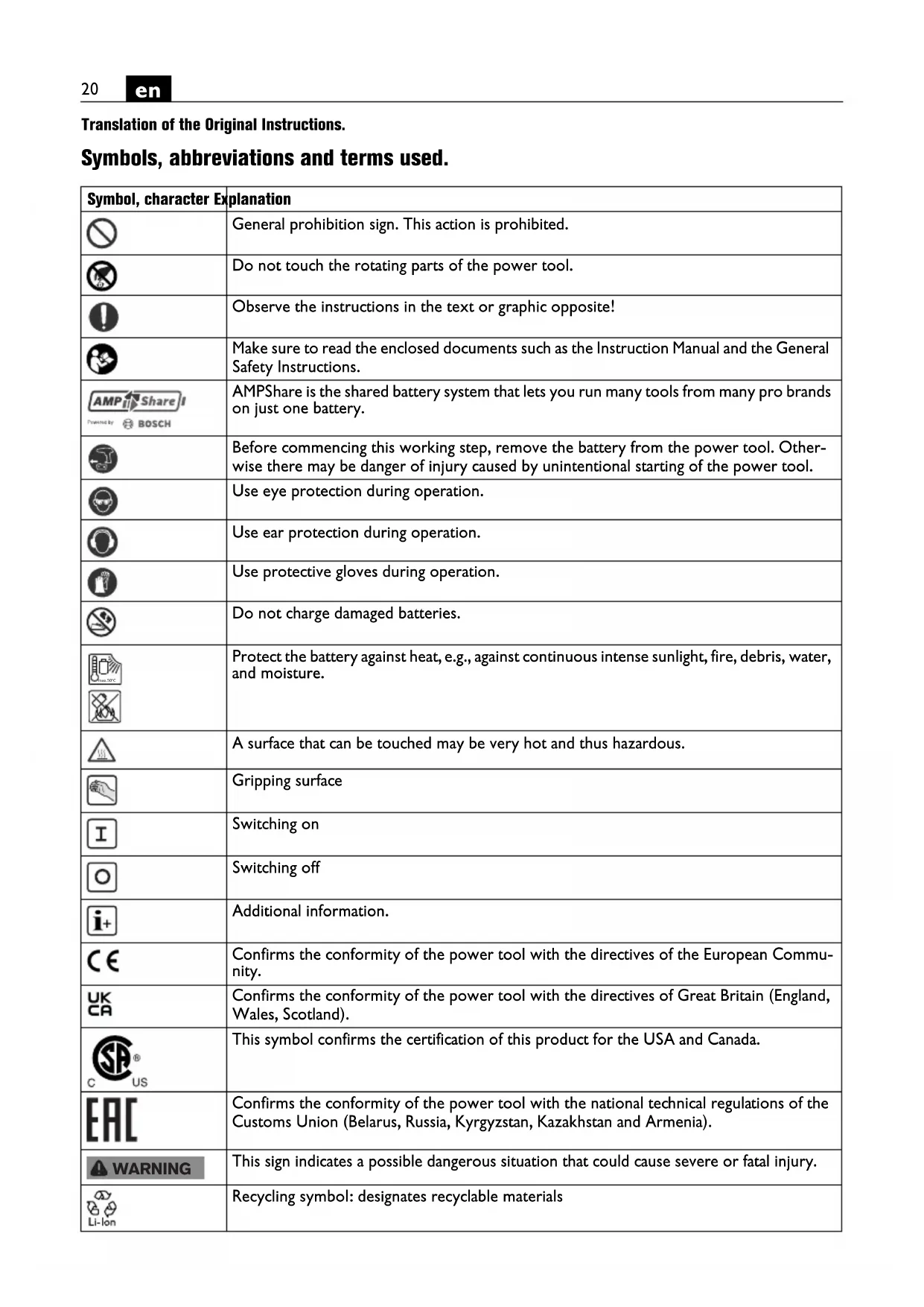 Translation of the Original Instructions. Symbols, abbreviations and terms used. Symbol, character Explanation General prohibition sign. This action is prohibited. Do not touch the rotating parts of the power tool. Observe the instructions in the text or graphic opposite! Make sure to read the enclosed documents such as the Instruction Manual and the General Safety Instructions. AMPShare is the shared battery system that lets you run many tools from many pro brands on just one battery. Before commencing this working step, remove the battery from the power tool. Other- wise there may be danger of injury caused by unintentional starting of the power tool. Use eye protection during operation. Use ear protection during operation. Use protective gloves during operation. Do not charge damaged batteries. Protect the battery against heat, e.g., against continuous intense sunlight, fire, debris, water, and moisture. A surface that can be touched may be very hot and thus hazardous. Gripping surface Switching on Switching off Additional information. Confirms the conformity of the power tool with the directives of the European Commu- nity. Confirms the conformity of the power tool with the directives of Great Britain (England, Wales, Scotland). This symbol confirms the certification of this product for the USA and Canada. Confirms the conformity of the power tool with the national technical regulations of the Customs Union (Belarus, Russia, Kyrgyzstan, Kazakhstan and Armenia). This sign indicates a possible dangerous situation that could cause severe or fatal injury. Recycling symbol: designates recyclable materials max.50°C WARNING21