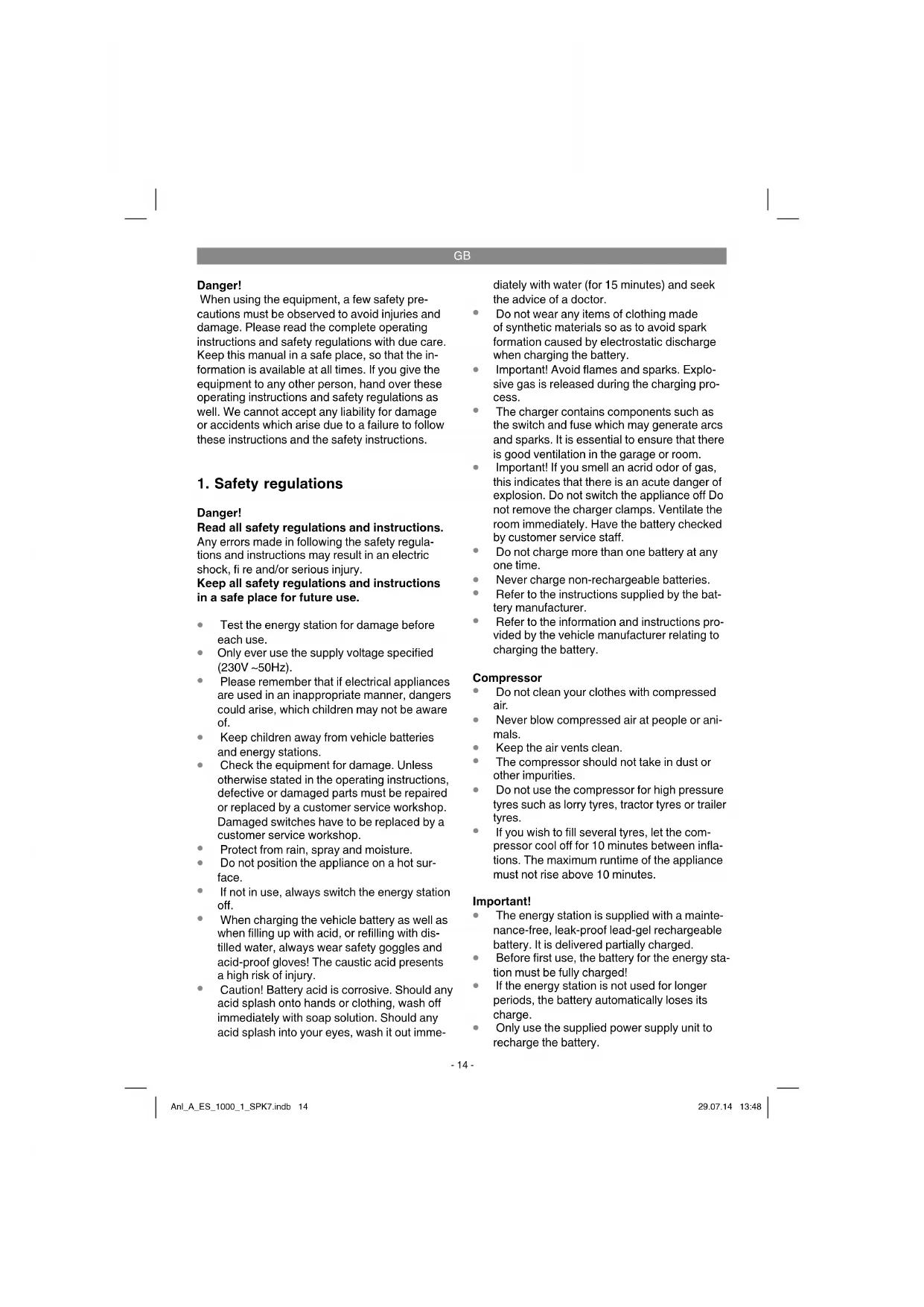 The energy station is NOT designed to start completely discharged batteries! The terminals are insulated to prevent accidental short-circuiting when connecting the terminals to the vehicle’s battery and parts. Short-circuits must be avoided at all costs. The jump-start feature of the energy station off ers a welcome helping hand when having start-up diffi culties because of low battery capacity in the motor vehicle battery. We would like to point out that even standard vehicles are fi tted with a whole host of electronic equipment (such as ABS, ASR, injection pump, on-board computer and car phone). The raised starting voltage and occurrence of voltage peaks could possibly lead to defects in the electronic components when starting up. Subsequent dama- ge caused by jump-starting cannot be covered by the product liability insurance. Please also refer to the instructions in the owner’s manuals for the car, radio, navigation system, etc. Anl_A_ES_1000_1_SPK7.indb 16Anl_A_ES_1000_1_SPK7.indb 16 29.07.14 13:4829.07.14 13:48GB