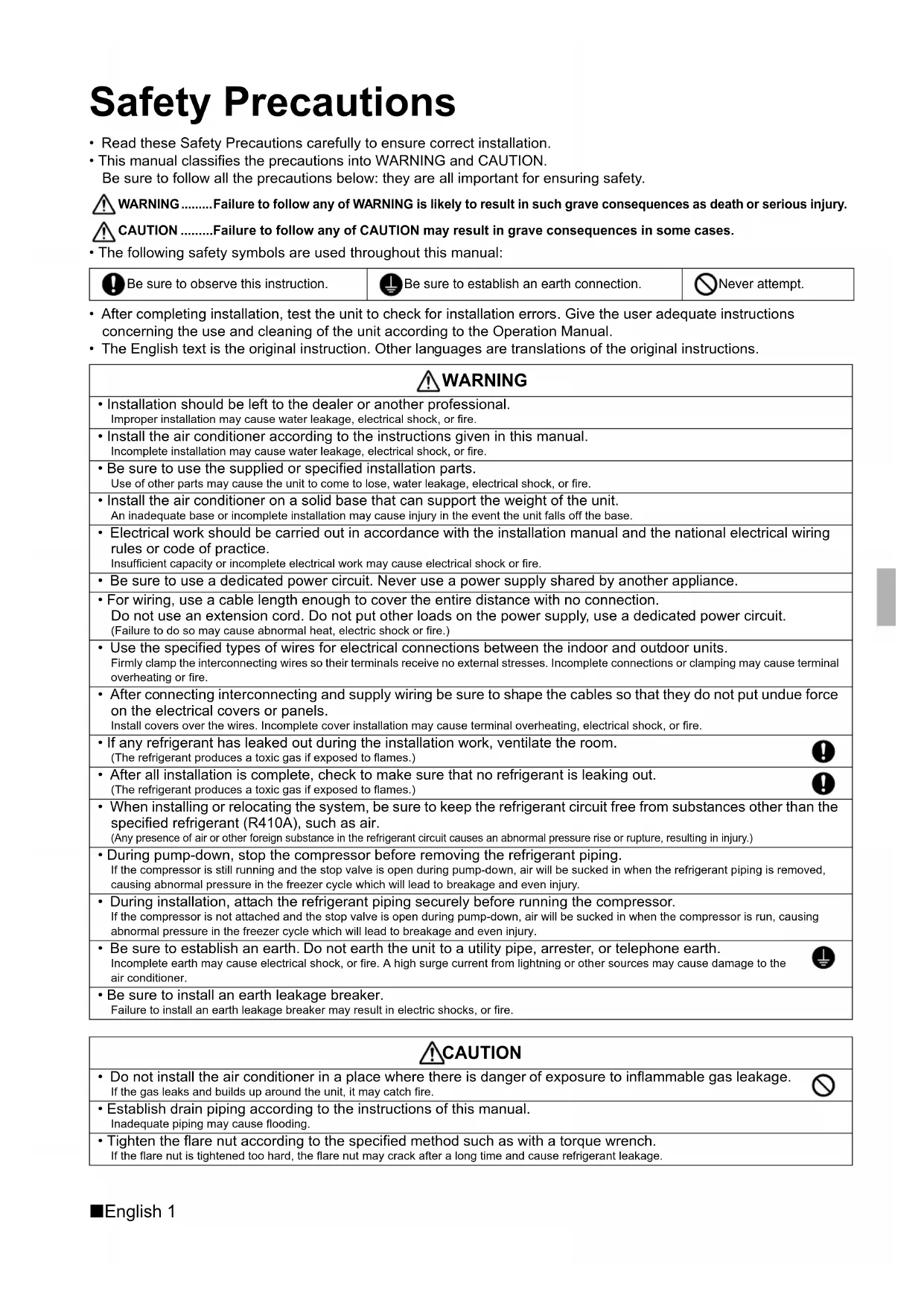 - Be sure to install an earth leakage breaker. Failure to install an earth leakage breaker may result in electric shocks, or fire. CAUTION