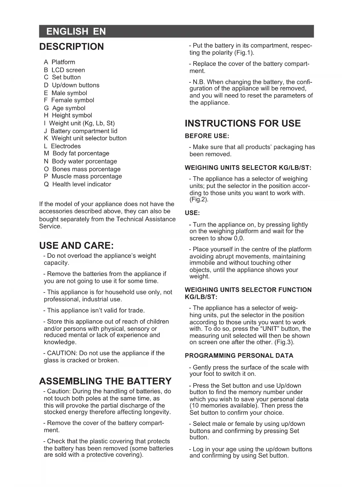 BEFORE USE: - Make sure that all products’ packaging has been removed. WEIGHING UNITS SELECTOR KG/LB/ST: - The appliance has a selector of weighing units; put the selector in the position accor- ding to those units you want to work with. (Fig.2). USE: - Turn the appliance on, by pressing lightly on the weighing platform and wait for the screen to show 0,0. - Place yourself in the centre of the platform avoiding abrupt movements, maintaining immobile and without touching other objects, until the appliance shows your weight.
