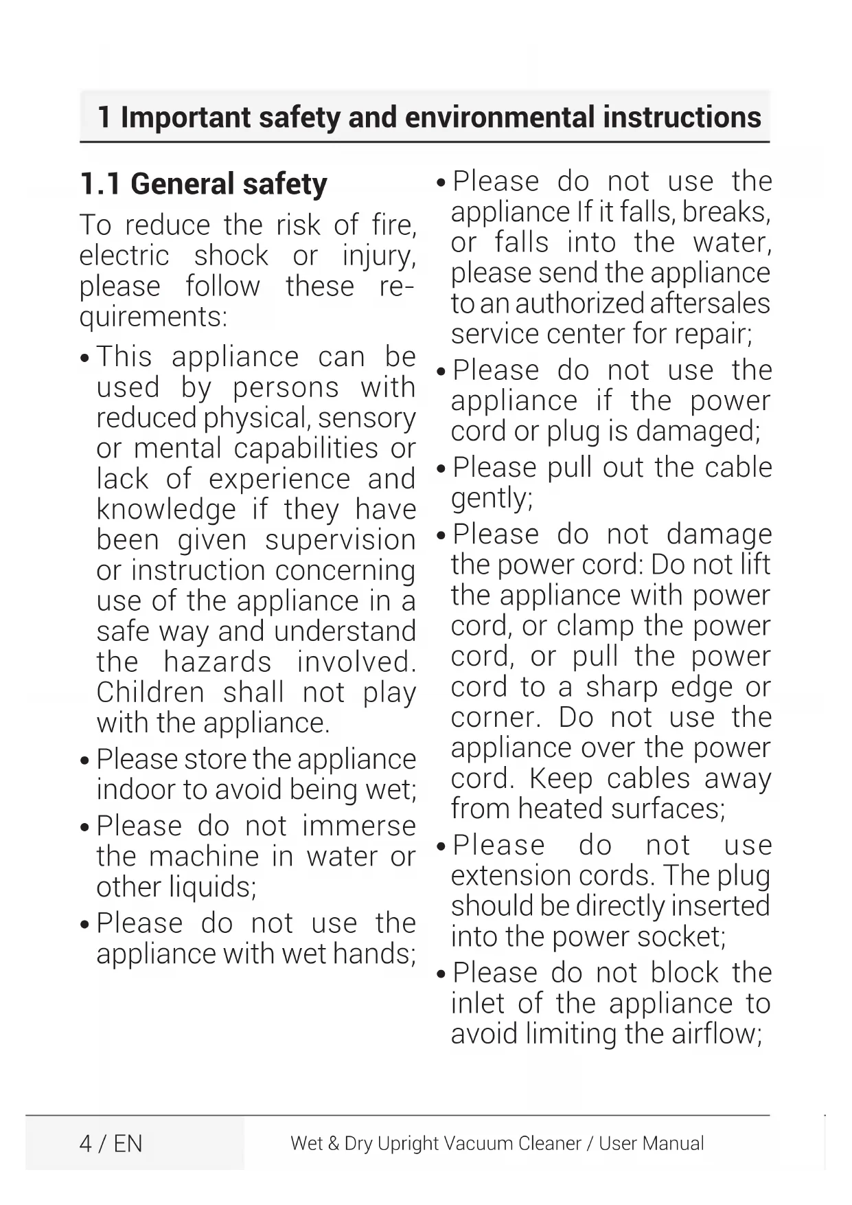 - Please do not block the inlet of the appliance to avoid limiting the airflow; 1 Important safety and environmental instructionsWet & Dry Upright Vacuum Cleaner / User Manual 5 / EN