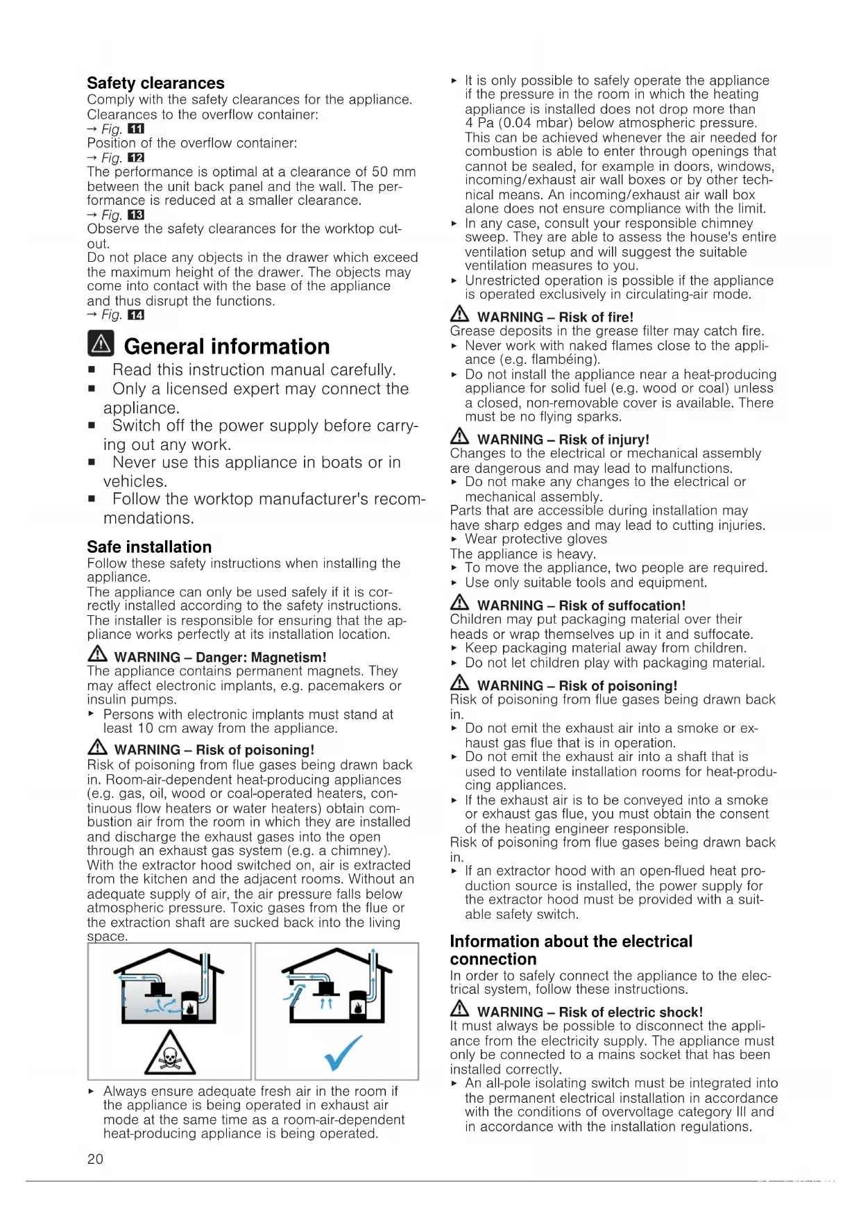 Persons with electronic implants must stand at least 10cm away from the appliance. WARNING‒Risk of poisoning! Risk of poisoning from flue gases being drawn back in. Room-air-dependent heat-producing appliances (e.g. gas, oil, wood or coal-operated heaters, con- tinuous flow heaters or water heaters) obtain com- bustion air from the room in which they are installed and discharge the exhaust gases into the open through an exhaust gas system (e.g. a chimney). With the extractor hood switched on, air is extracted from the kitchen and the adjacent rooms. Without an adequate supply of air, the air pressure falls below atmospheric pressure. Toxic gases from the flue or the extraction shaft are sucked back into the living space.