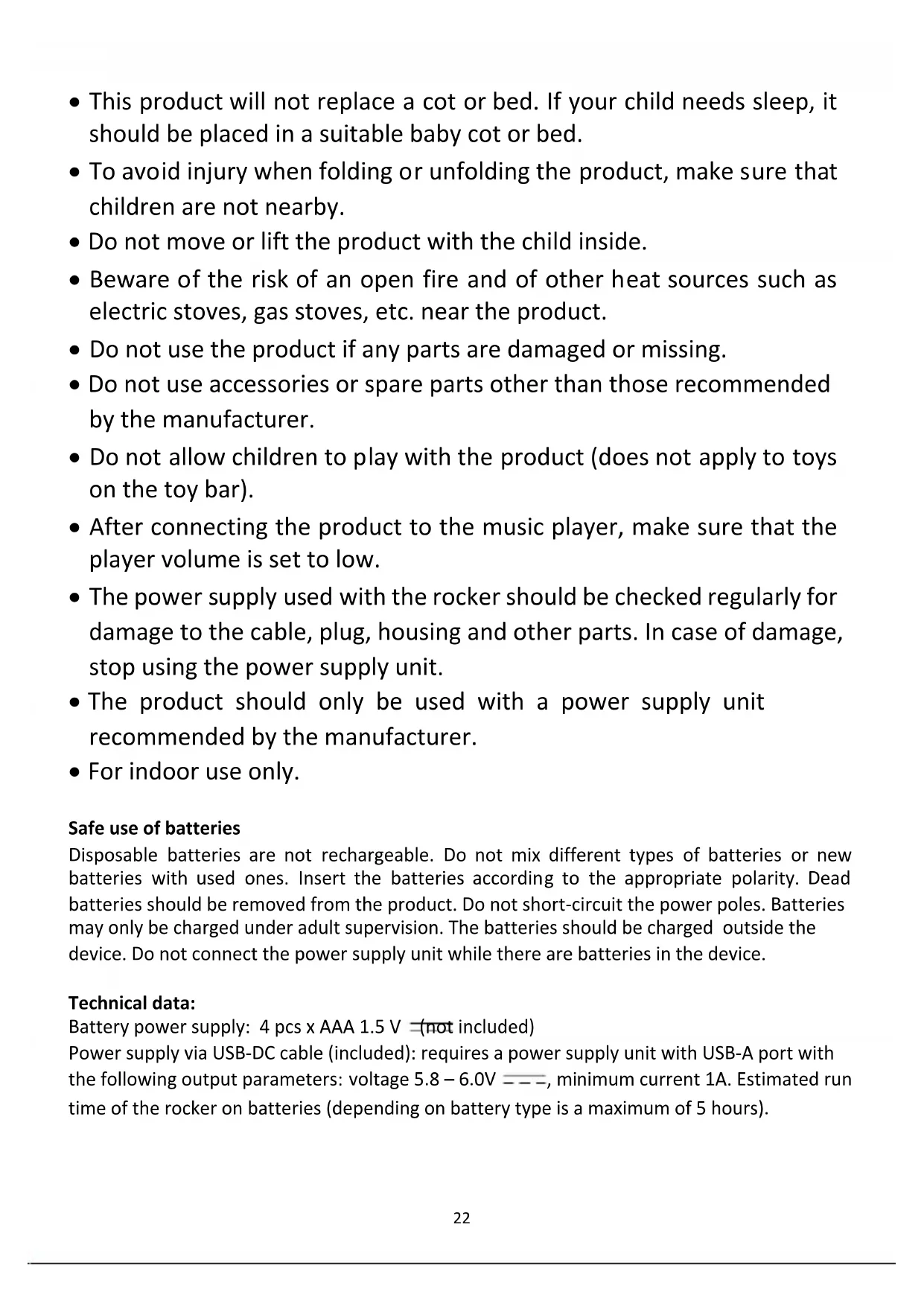 - For indoor use only. Safe use of batteries Disposable batteries are not rechargeable. Do not mix different types of batteries or new batteries with used ones. Insert the batteries according to the appropriate polarity. Dead batteries should be removed from the product. Do not short-circuit the power poles. Batteries may only be charged under adult supervision. The batteries should be charged outside the device. Do not connect the power supply unit while there are batteries in the device. Technical data: Battery power supply: 4 pcs x AAA 1.5 V (not included) Power supply via USB-DC cable (included): requires a power supply unit with USB-A port with the following output parameters: voltage 5.8 – 6.0V , minimum current 1A. Estimated run time of the rocker on batteries (depending on battery type is a maximum of 5 hours).23