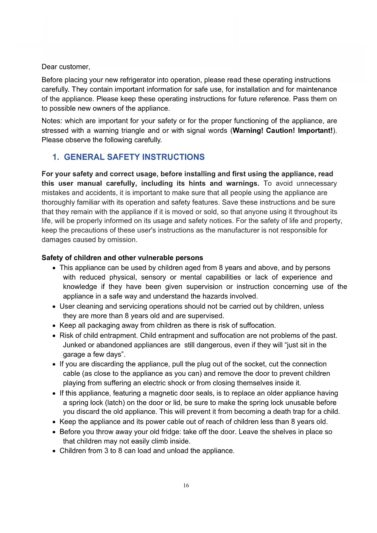 For your safety and correct usage, before installing and first using the appliance, read this user manual carefully, including its hints and warnings. To avoid unnecessary mistakes and accidents, it is important to make sure that all people using the appliance are thoroughly familiar with its operation and safety features. Save these instructions and be sure that they remain with the appliance if it is moved or sold, so that anyone using it throughout its life, will be properly informed on its usage and safety notices. For the safety of life and property, keep the precautions of these user's instructions as the manufacturer is not responsible for damages caused by omission. Safety of children and other vulnerable persons