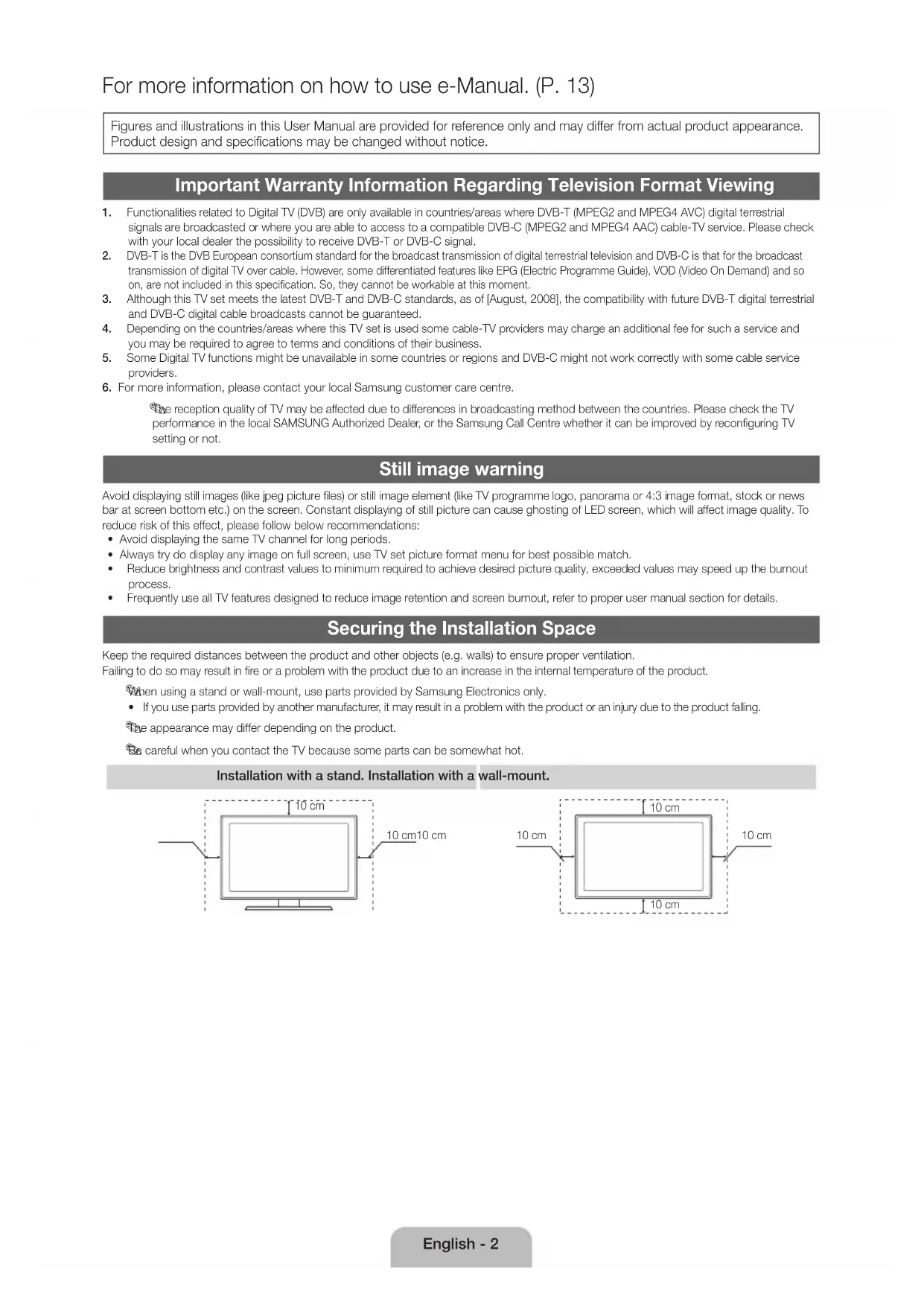 - Frequently use all TV features designed to reduce image retention and screen burnout, refer to proper user manual section for details. Securing the Installation Space Keep the required distances between the product and other objects (e.g. walls) to ensure proper ventilation. Failing to do so may result in fire or a problem with the product due to an increase in the internal temperature of the product.
