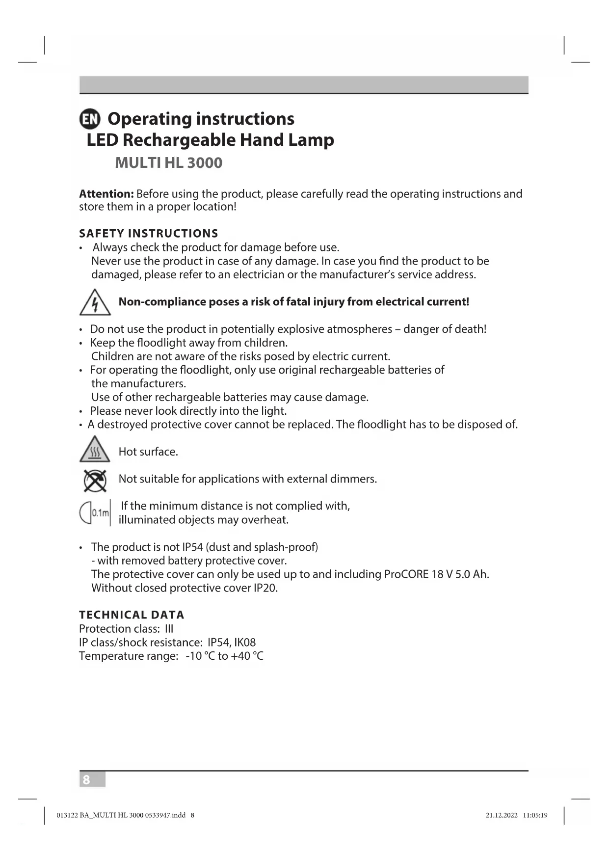 The product is not IP54 (dust and splash-proof) - with removed battery protective cover. The protective cover can only be used up to and including ProCORE 18 V 5.0 Ah. Without closed protective cover IP20. TECHNICAL DATA Protection class: III IP class/shock resistance: IP54, IK08 Temperature range: -10 °C to +40 °C 013122 BA_MULTI HL 3000 0533947.indd 8013122 BA_MULTI HL 3000 0533947.indd 8 21.12.2022 11:05:1921.12.2022 11:05:199 MULTI HL 3000 Operating instructions Model: MULTI HL 3000 Compatible battery types: You can nd an overview of all available adapters and the matching batteries on our homepage www.brennenstuhl.com Max. projected area: 183.63 cm