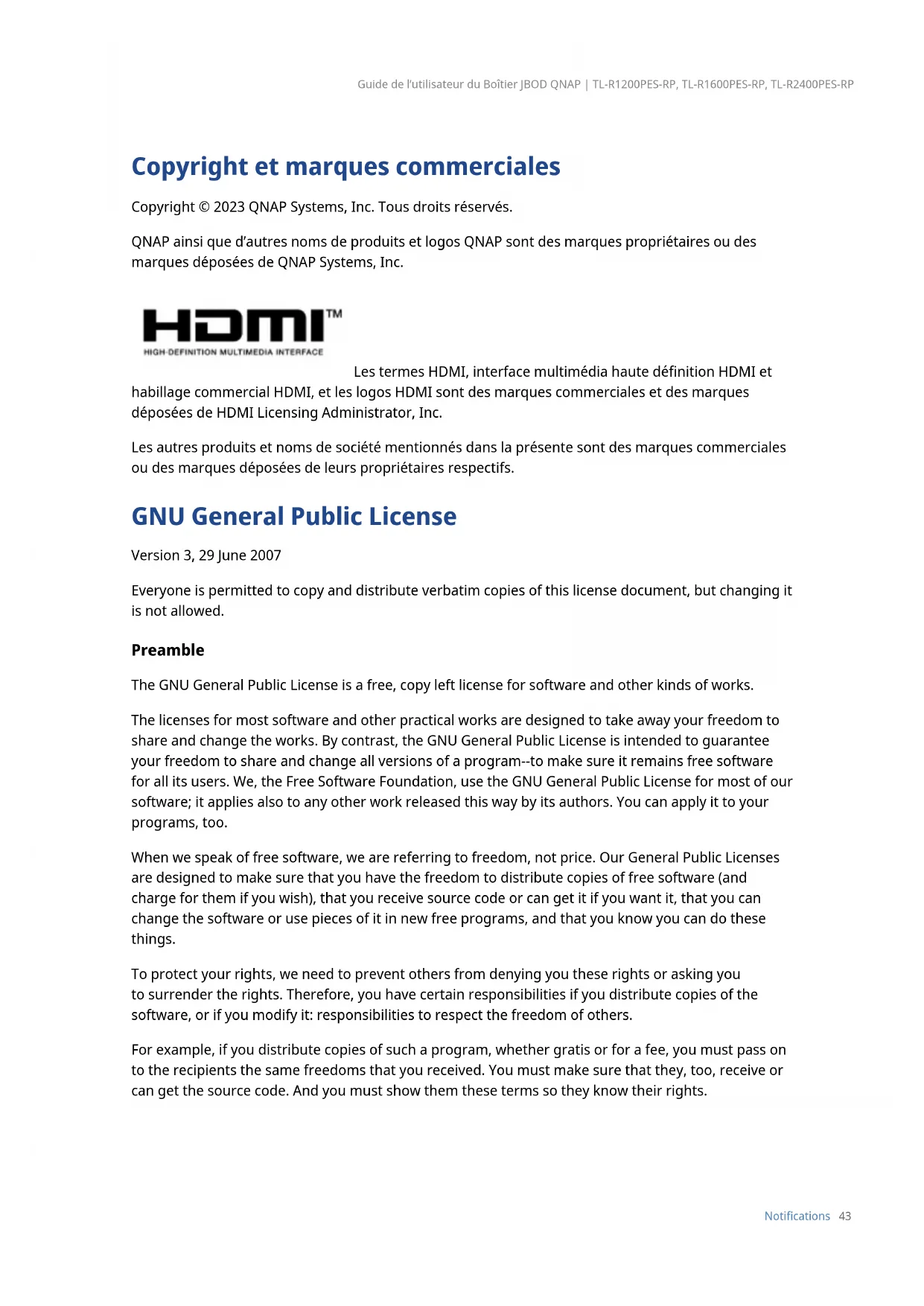 “Additional permissions” are terms that supplement the terms of this License by making exceptions from one or more of its conditions. Additional permissions that are applicable to the entire Program shall be treated as though they were included in this License, to the extent that they are valid under applicable law. If additional permissions apply only to part of the Program, that part may be used separately under those permissions, but the entire Program remains governed by this License without regard to the additional permissions. When you convey a copy of a covered work, you may at your option remove any additional permissions from that copy, or from any part of it. (Additional permissions may be written to require their own removal in certain cases when you modify the work.) You may place additional permissions on material, added by you to a covered work, for which you have or can give appropriate copyright permission. Notwithstanding any other provision of this License, for material you add to a covered work, you may (if authorized by the copyright holders of that material) supplement the terms of this License with terms: a. Disclaiming warranty or limiting liability dierently from the terms of sections 15 and 16 of this License; or b. Requiring preservation of specied reasonable legal notices or author attributions in that material or in the Appropriate Legal Notices displayed by works containing it; or c. Prohibiting misrepresentation of the origin of that material, or requiring that modied versions of such material be marked in reasonable ways as dierent from the original version; or d. Limiting the use for publicity purposes of names of licensors or authors of the material; or e. Declining to grant rights under trademark law for use of some trade names, trademarks, or service marks; or f. Requiring indemnication of licensors and authors of that material by anyone who conveys the material (or modied versions of it) with contractual assumptions of liability to the recipient, for any liability that these contractual assumptions directly impose on those licensors and authors. All other non-permissive additional terms are considered “further restrictions” within the meaning of section 10. If the Program as you received it, or any part of it, contains a notice stating that it is governed by this License along with a term that is a further restriction, you may remove that term. If a license document contains a further restriction but permits relicensing or conveying under this License, you may add to a covered work material Guide de l’utilisateur du Boîtier JBOD QNAP | TL-R1200PES-RP, TL-R1600PES-RP, TL-R2400PES-RP Notications 48governed by the terms of that license document, provided that the further restriction does not survive such relicensing or conveying. If you add terms to a covered work in accord with this section, you must place, in the relevant source les, a statement of the additional terms that apply to those les, or a notice indicating where to nd the applicable terms. Additional terms, permissive or non-permissive, may be stated in the form of a separately written license, or stated as exceptions; the above requirements apply either way.