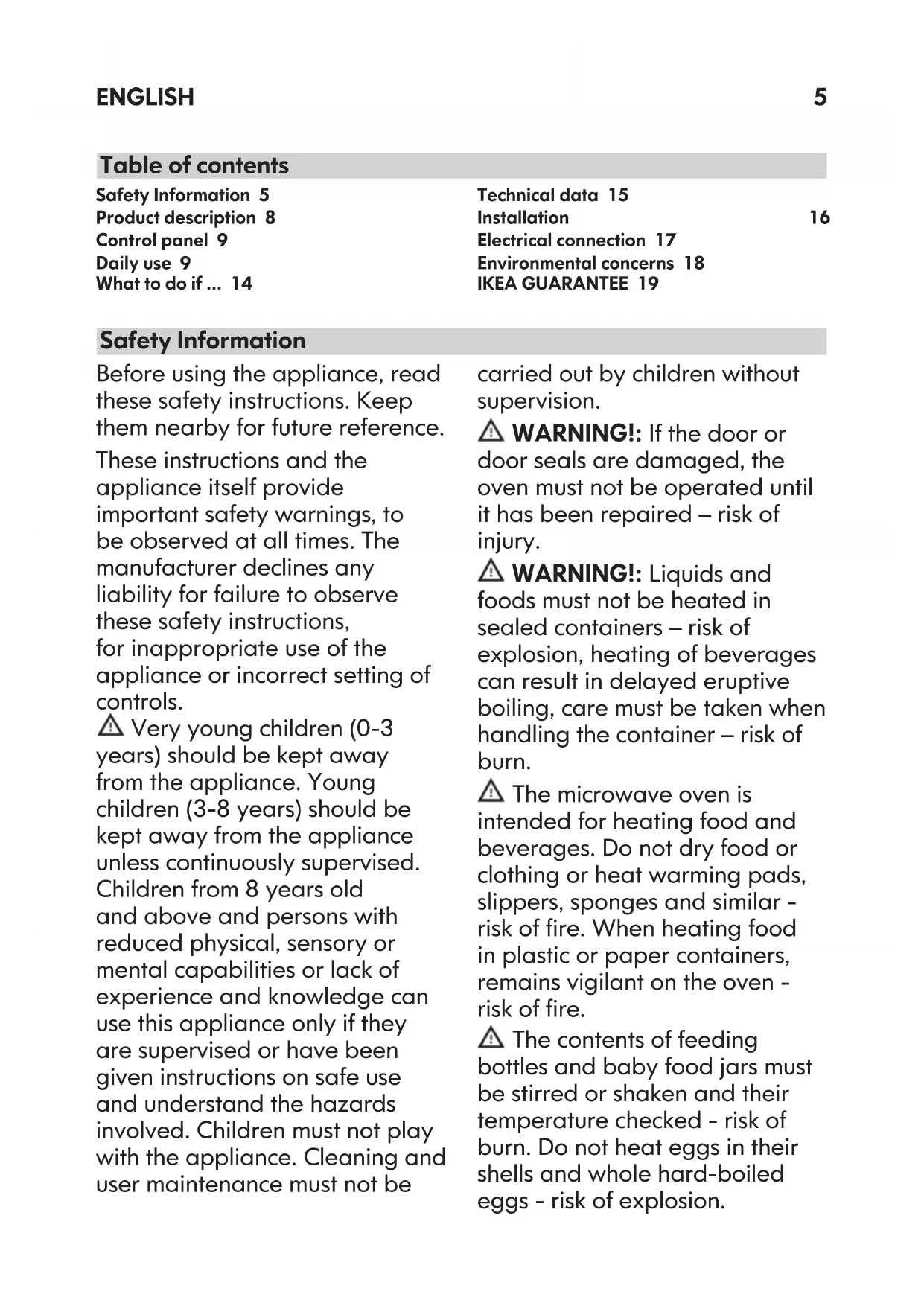 ITPlease refer to the last page of this manual for the full list of IKEA appointed Authorized Service Centre and relative national phone numbers. Gehen Sie dazu auf die letzte Seite dieser Broschüre. Dort nden Sie eine Übersicht mit den entsprechenden Telefonnummern und Kontaktdaten unserer autorisierten Kundendienste. Consultez la dernière page de ce manuel pour la liste complète des centre d’entretien et de réparation agréés IKEA avec leur numéro de téléphone respectifs. Siete pregati di contattare il numero del Centro Assistenza Autorizzato incaricato da IKEA riportato sull’ultima pagina di questo manuale. ENGLISH 5 DEUTSCH 21 FRANÇAIS 37 ITALIANO 54min 300 mm min. 355 mm 564 mm min 560 mm min 355 mm 564 mm min 560 mm min 355 mm 568 mm min 560 mm min 355 mm 568 mm 10 0cm 80cm5 Before using the appliance, read these safety instructions. Keep them nearby for future reference. These instructions and the appliance itself provide important safety warnings, to be observed at all times. The manufacturer declines any liability for failure to observe these safety instructions, for inappropriate use of the appliance or incorrect setting of controls. Very young children (0-3 years) should be kept away from the appliance. Young children (3-8 years) should be kept away from the appliance unless continuously supervised. Children from 8 years old and above and persons with reduced physical, sensory or mental capabilities or lack of experience and knowledge can use this appliance only if they are supervised or have been given instructions on safe use and understand the hazards involved. Children must not play with the appliance. Cleaning and user maintenance must not be Safety Information Table of contents carried out by children without supervision. WARNING!: If the door or door seals are damaged, the oven must not be operated until it has been repaired – risk of injury. WARNING!: Liquids and foods must not be heated in sealed containers – risk of explosion, heating of beverages can result in delayed eruptive boiling, care must be taken when handling the container – risk of burn. The microwave oven is intended for heating food and beverages. Do not dry food or clothing or heat warming pads, slippers, sponges and similar - risk of re. When heating food in plastic or paper containers, remains vigilant on the oven - risk of re. The contents of feeding bottles and baby food jars must be stirred or shaken and their temperature checked - risk of burn. Do not heat eggs in their shells and whole hard-boiled eggs - risk of explosion. Safety Information 5 Product description 8 Control panel 9 Daily use 9 What to do if ... 14 Technical data 15 Installation 16 Electrical connection 17 Environmental concerns 18 IKEA GUARANTEE 19