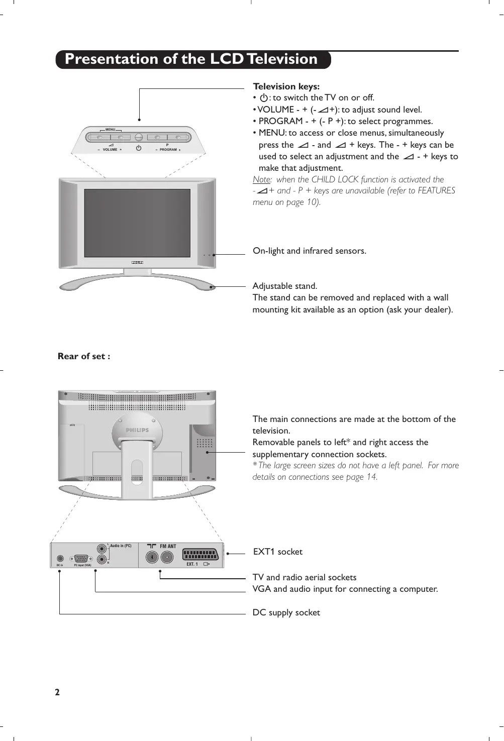 - PROGRAM + On-light and infrared sensors. Adjustable stand. The stand can be removed and replaced with a wall mounting kit available as an option (ask your dealer). Rear of set : The main connections are made at the bottom of the television. Removable panels to left* and right access the supplementary connection sockets.