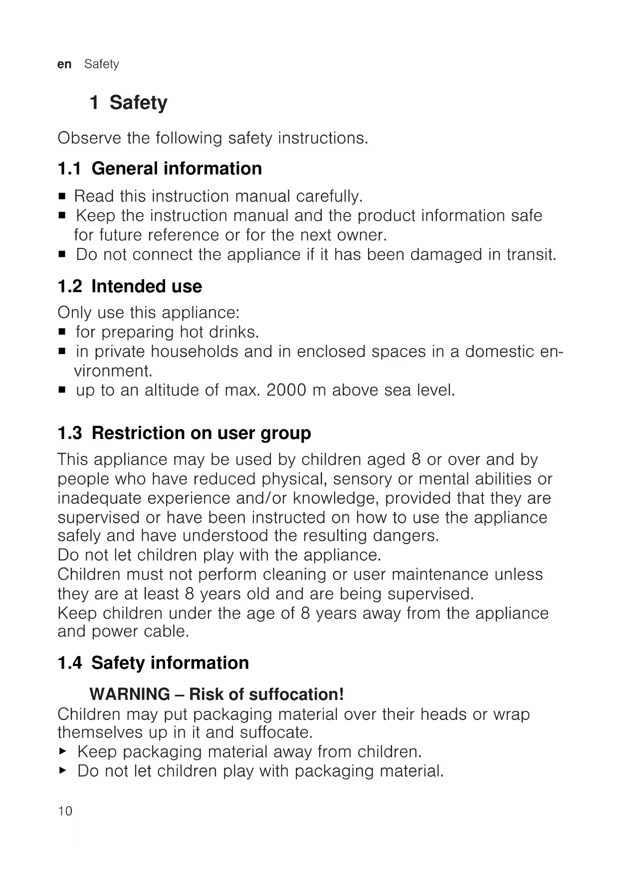 Read this instruction manual carefully. ¡ Keep the instruction manual and the product information safe for future reference or for the next owner. ¡ Do not connect the appliance if it has been damaged in transit. 1.2 Intended use Only use this appliance: ¡ for preparing hot drinks. ¡ in private households and in enclosed spaces in a domestic en- vironment. ¡ up to an altitude of max. 2000m above sea level. 1.3 Restriction on user group This appliance may be used by children aged 8 or over and by people who have reduced physical, sensory or mental abilities or inadequate experience and/or knowledge, provided that they are supervised or have been instructed on how to use the appliance safely and have understood the resulting dangers. Do not let children play with the appliance. Children must not perform cleaning or user maintenance unless they are at least 8 years old and are being supervised. Keep children under the age of 8 years away from the appliance and power cable. 1.4 Safety information WARNING‒Risk of suffocation! Children may put packaging material over their heads or wrap themselves up in it and suffocate. ▶ Keep packaging material away from children. ▶ Do not let children play with packaging material.Safety en
