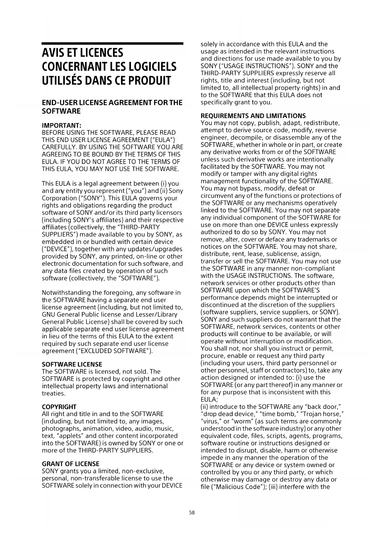 ant, you acknowledge that the SOFTWARE may include EXCLUDED SOFTWARE. Certain EXCLUDED SOFTWARE may be covered by open source software licenses (“Open Source Components”), which means any software licenses approved as open source licenses by the Open Source Initiative or any substantially similar licenses, including but not limited to any license that, as a condition of distribution of the software licensed under such license, requires that the distributor make the software available in source code format. If and to the extent disclosure is required, please visit oss.sony.net/ Products/Linux or other SONY-designated web site for a list of applicable OPEN SOURCE COMPONENTS included in the SOFTWARE from time to time, and the applicable terms and conditions governing its use. Such terms and conditions may be changed by the applicable third party at any time without liability to you. To the extent required by the licenses covering EXCLUDED SOFTWARE, the terms of such licenses will apply in lieu of the terms of this EULA. To the extent the terms of the licenses applicable to EXCLUDED SOFTWARE prohibit any of the restrictions in this EULA with respect to such EXCLUDED SOFTWARE, such restrictions will not apply to such EXCLUDED SOFTWARE. To the extent the terms of the licenses applicable to Open Source Components require SONY to make an offer to provide source code in connection with the SOFTWARE, such offer is hereby made.