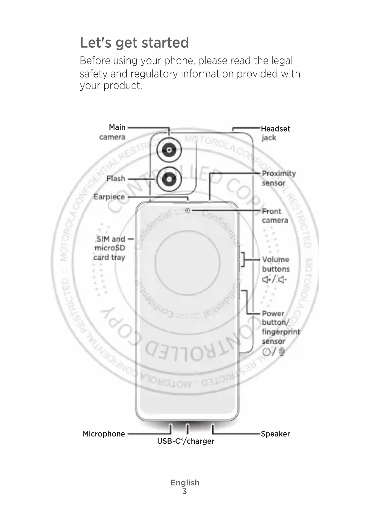 - Get apps: tap Play Store to browse and download apps. Legal information. This guide provides important legal, safety and regulatory information that you should read before using your product. For the complete legal information, from the Home screen swipe up and tap Settings > , then type Legal information or visit www.motorola.com/device-legal. Water repellent. Your phone is not waterproof. For more about your phone's water-repellent design and care, swipe up and tap Settings > Help. Charging and battery safety. To prevent possible burning and injury, the battery in your phone should only be removed by a Motorola- approved service centre or similar skilled personnel. If your phone becomes unresponsive, press and hold the power button until the screen goes dark and your phone restarts. Charge your phone using a compatible Motorola charger (may be sold separately). Use of other chargers is not recommended and may impair the charging performance. Don't charge your phone in temperatures below -20°C or above 45°C. Chargers that do not comply with applicable national standards may be unsafe, with risk of death or injury, and may cause slow charging or product damage. To view applicable standards and to learn more, see the "Legal information" section of this guide or visit www.motorola.com/device-legal. Warning about high volume usage. To prevent possible hearing damage, do not listen at high volume levels for long periods. When your headset volume reaches the high volume threshold, a warning will be shown. Tap OK to dismiss it, or wait one to five seconds, then press the Volume up button to dismiss the alert and enable the volume to continue to be adjusted. Disposal and recycling. For help recycling products and packaging responsibly, visit www.motorola.com/recycling. Extreme heat or cold. Don't use your phone in temperatures below -20°C or above 45°C. Don't store/transport your phone in temperatures below -20°C or above 60°C. Legal disclaimers. Features, services and applications are network dependent and may not be available in all areas; additional terms/ charges may apply. Product specifications and other information contained in this guide are believed to be accurate at the time of printing. Motorola reserves the right to correct or change any information without notice. Arbitration. Your purchase is governed by a binding arbitration clause. For more information and how to opt out, see the legal guide6 that came with your phone. SAR information (on e-label). To view specific absorption rate (SAR) values for this phone, from the Home screen swipe up and tap Settings > , then type Regulatory labels, from your phone's dial pad type *#07# or visit www.motorola.com/sar. Supported frequencies and power (Model XT2421-3). This phone is capable of operation on the following frequencies, subject to location and network availability. Operating mode Frequency range MHz/band Maximum nominal transmit power dBm Bluetooth 2400 – 2483.5 20 dBm EIRP Wi-Fi 2400 – 2483.5 20 dBm EIRP Wi-Fi 5150 – 5250 23 dBm EIRP Wi-Fi 5250 – 5350 20 dBm EIRP Wi-Fi 5470 – 5725 20 dBm EIRP Wi-Fi 5725 – 5850 14 dBm EIRP