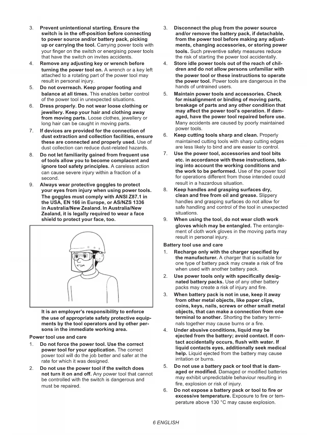 your eyes from injury when using power tools. The goggles must comply with ANSI Z87.1 in the USA, EN 166 in Europe, or AS/NZS 1336 in Australia/New Zealand. In Australia/New Zealand, it is legally required to wear a face shield to protect your face, too. It is an employer's responsibility to enforce the use of appropriate safety protective equip- ments by the tool operators and by other per- sons in the immediate working area. Power tool use and care