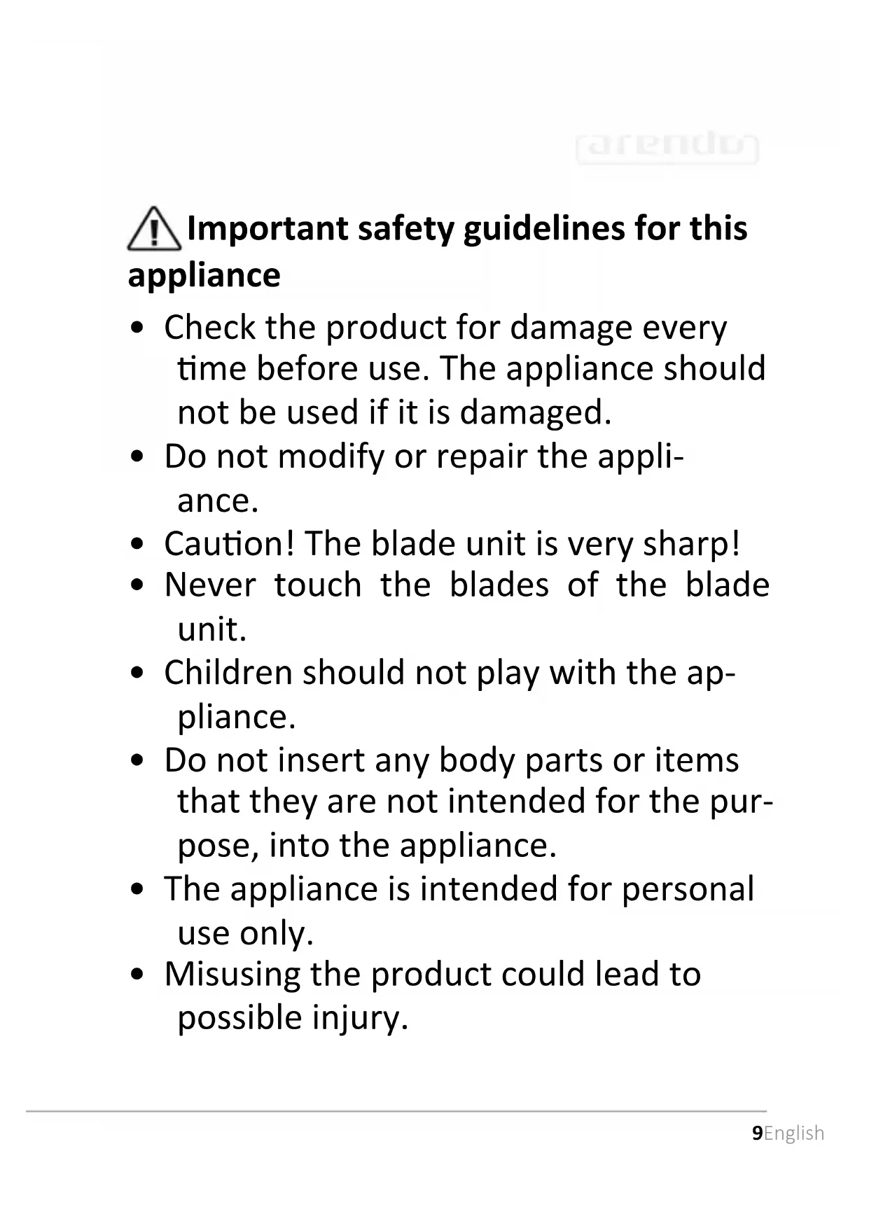 - Do not insert any body parts or items that they are not intended for the purpose, into the appliance.
