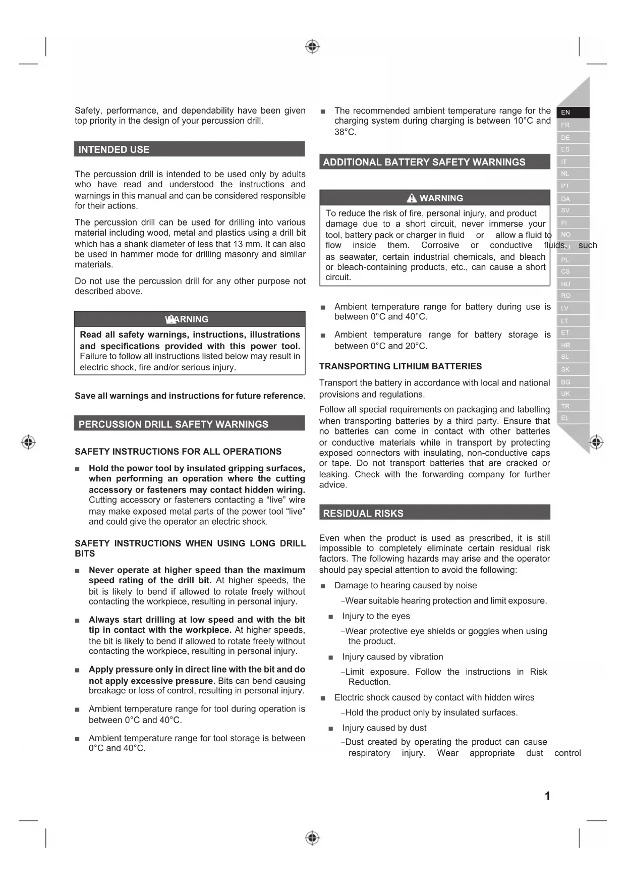 Transport the battery in accordance with local and national provisions and regulations. Follow all special requirements on packaging and labelling when transporting batteries by a third party. Ensure that no batteries can come in contact with other batteries or conductive materials while in transport by protecting exposed connectors with insulating, non-conductive caps or tape. Do not transport batteries that are cracked or leaking. Check with the forwarding company for further advice. RESIDUAL RISKS Even when the product is used as prescribed, it is still impossible to completely eliminate certain residual risk factors. The following hazards may arise and the operator should pay special attention to avoid the following: Ŷ Damage to hearing caused by noise – Wear suitable hearing protection and limit exposure.