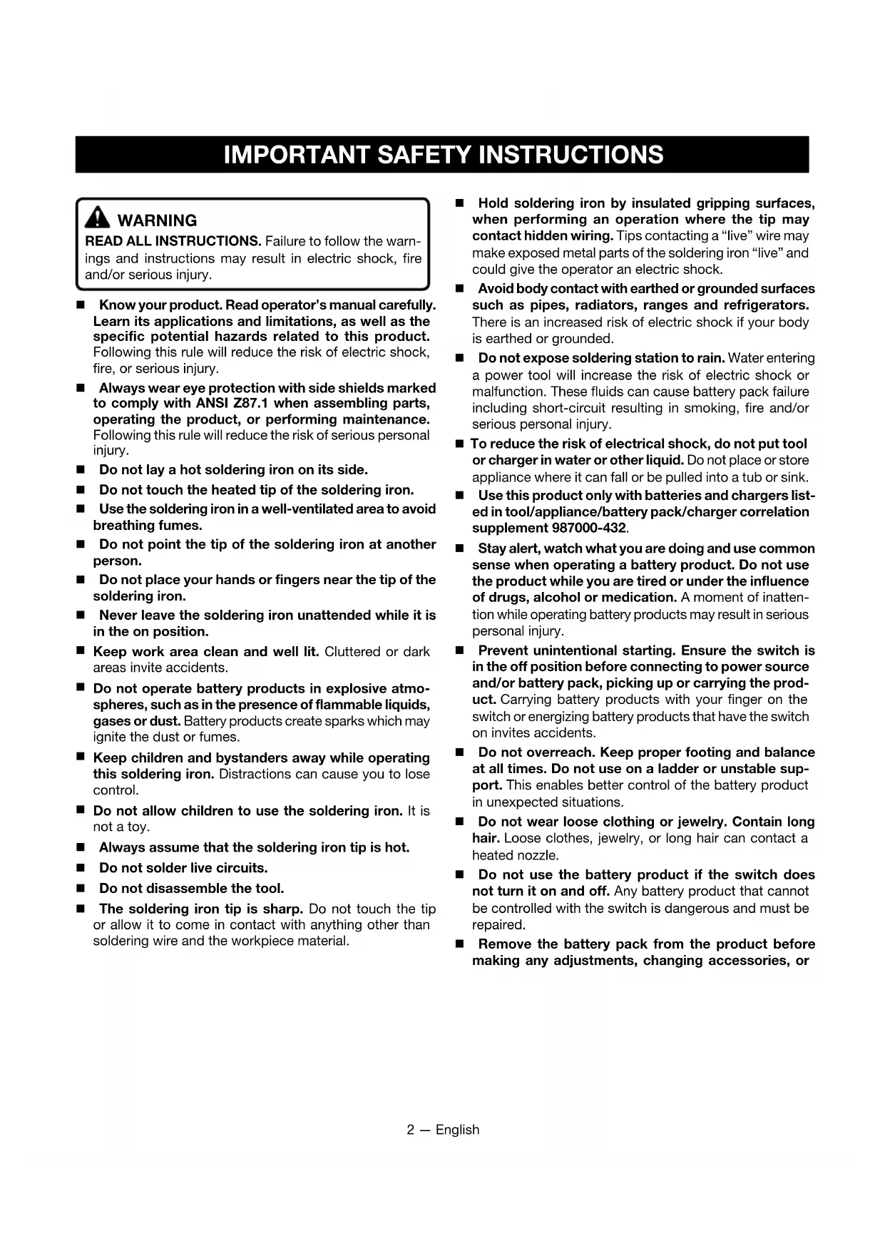 - Do not expose soldering station to rain. Water entering a power tool will increase the risk of electric shock or malfunction. These fluids can cause battery pack failure including short-circuit resulting in smoking, fire and/or serious personal injury.