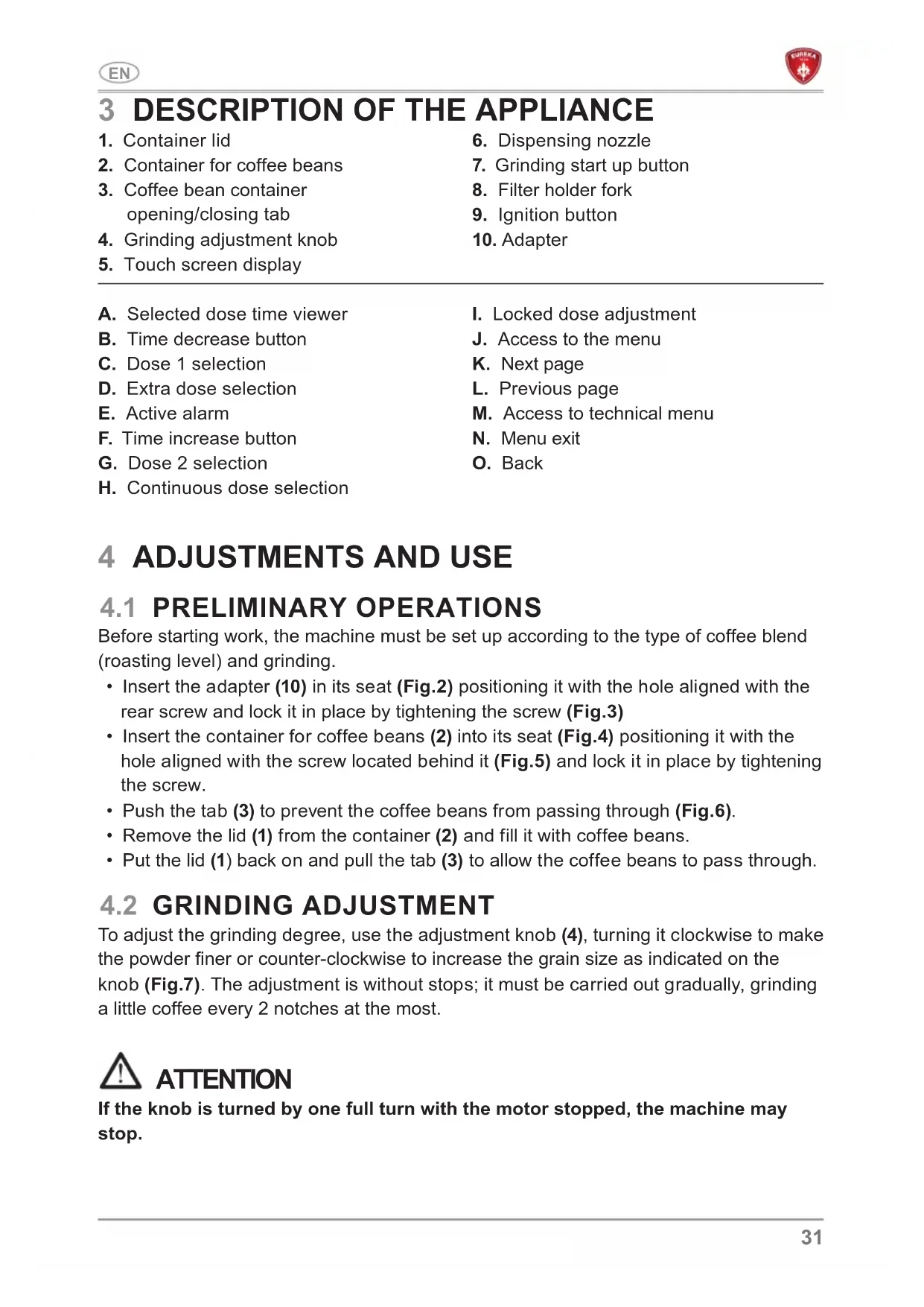 To adjust the grinding degree, use the adjustment knob (4), turning it clockwise to make the powder finer or counter-clockwise to increase the grain size as indicated on the knob (Fig.7). The adjustment is without stops; it must be carried out gradually, grinding a little coffee every 2 notches at the most. ATTENTION If the knob is turned by one full turn with the motor stopped, the machine may stop.32