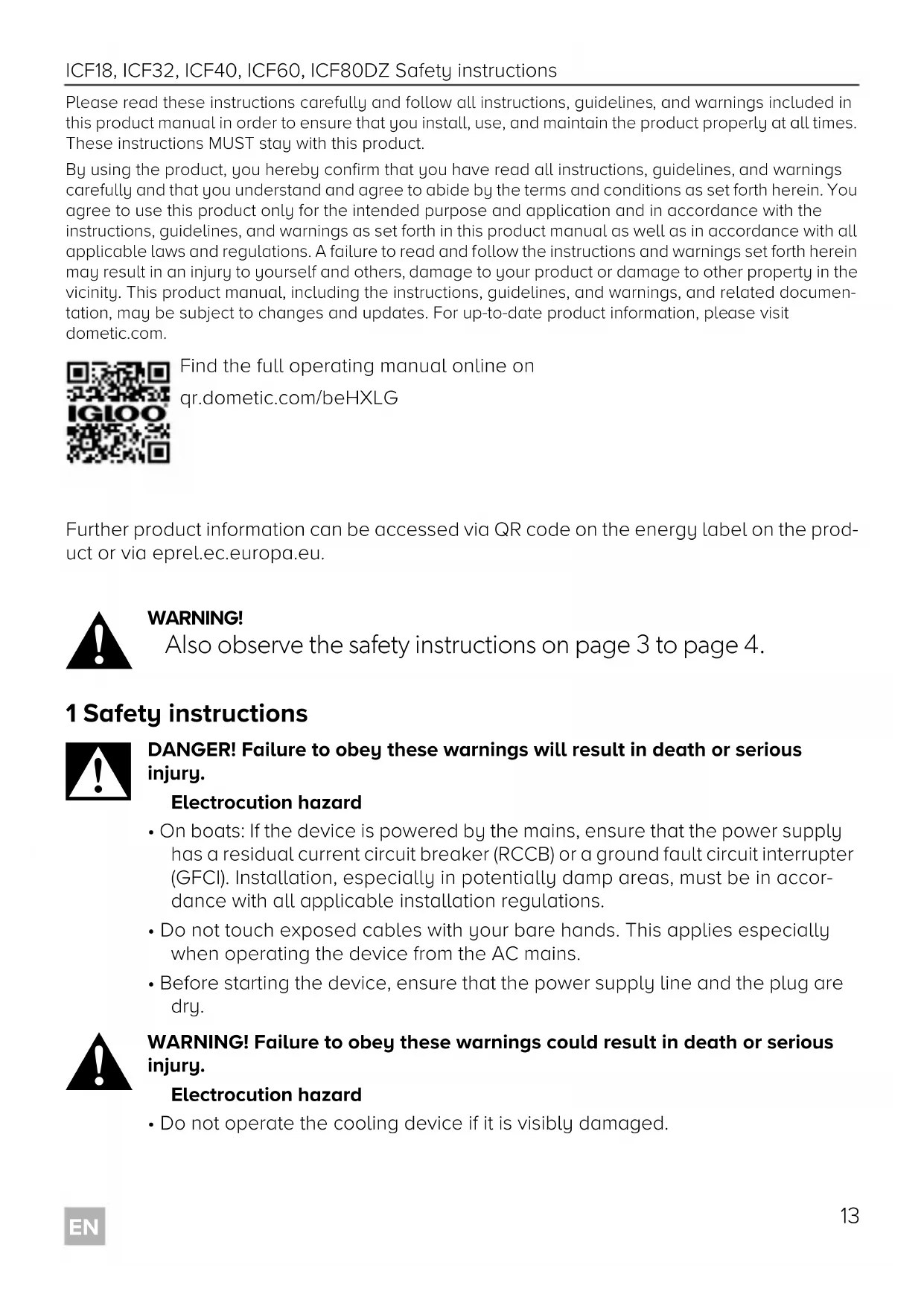 - Do not operate the cooling device if it is visibly damaged. Find the full operating manual online on qr.dometic.com/beHXLG Igloo ICF18, ICF32, ICF40, ICF60, ICF80DZ_ SOM_4445103836_ EMEA24-ar _202x-xx-xx.book Page 13 Friday, September 15, 2023 12:50 PMSafety instructions ICF18, ICF32, ICF40, ICF60, ICF80DZ