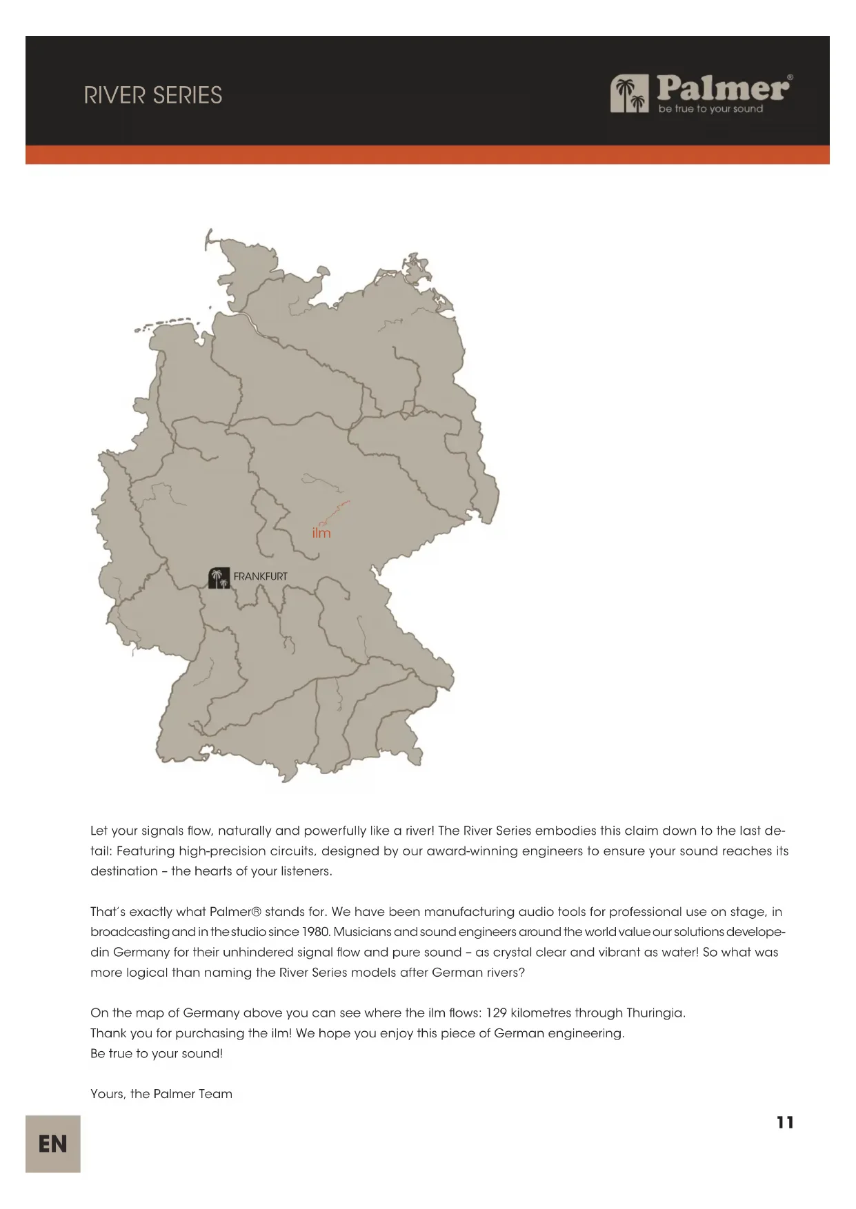 Let your signals ow, naturally and powerfully like a river! The River Series embodies this claim down to the last de- tail: Featuring high-precision circuits, designed by our award-winning engineers to ensure your sound reaches its destination– the hearts of your listeners. That’s exactly what Palmer® stands for. We have been manufacturing audio tools for professional use on stage, in broadcasting and in the studio since 1980. Musicians and sound engineers around the world value our solutions develope- din Germany for their unhindered signal ow and pure sound– as crystal clear and vibrant as water! So what was more logical than naming the River Series models after German rivers? On the map of Germany above you can see where the ilm ows: 129 kilometres through Thuringia. Thank you for purchasing the ilm! We hope you enjoy this piece of German engineering. Be true to your sound! Yours, the Palmer Team12