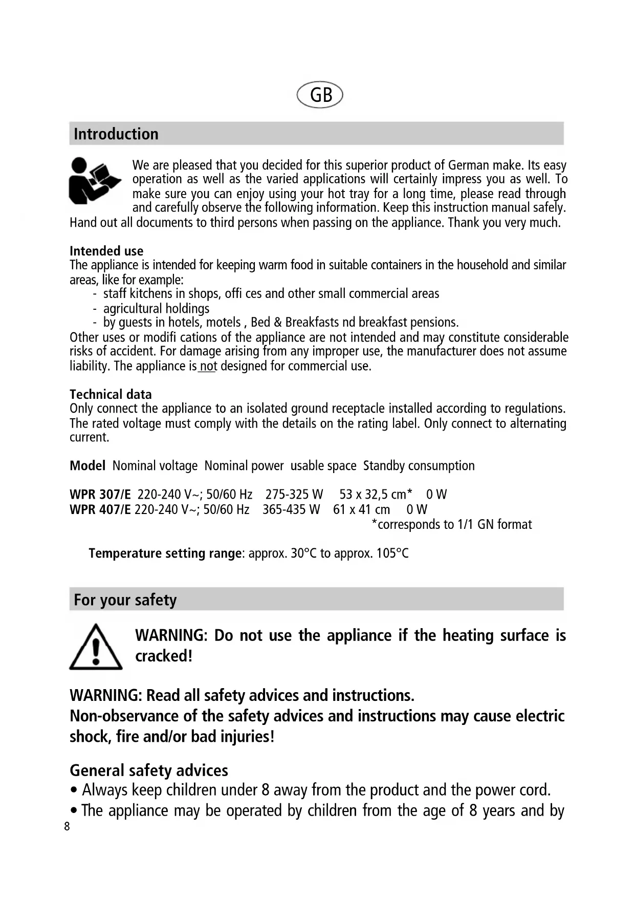 We are pleased that you decided for this superior product of German make. Its easy operation as well as the varied applications will certainly impress you as well. To make sure you can enjoy using your hot tray for a long time, please read through and carefully observe the following information. Keep this instruction manual safely. Hand out all documents to third persons when passing on the appliance. Thank you very much. Intended use The appliance is intended for keeping warm food in suitable containers in the household and similar areas, like for example: - staff kitchens in shops, offi ces and other small commercial areas - agricultural holdings - by guests in hotels, motels , Bed & Breakfasts nd breakfast pensions. Other uses or modifi cations of the appliance are not intended and may constitute considerable risks of accident. For damage arising from any improper use, the manufacturer does not assume liability. The appliance is not designed for commercial use. Technical data Only connect the appliance to an isolated ground receptacle installed according to regulations. The rated voltage must comply with the details on the rating label. Only connect to alternating current. Model Nominal voltage Nominal power usable space Standby consumption WPR 307/E 220-240 V~; 50/60 Hz 275-325 W 53 x 32,5 cm* 0 W WPR 407/E 220-240 V~; 50/60 Hz 365-435 W 61 x 41 cm 0 W *corresponds to 1/1 GN format Temperature setting range: approx. 30°C to approx. 105°C Introduction For your safety
