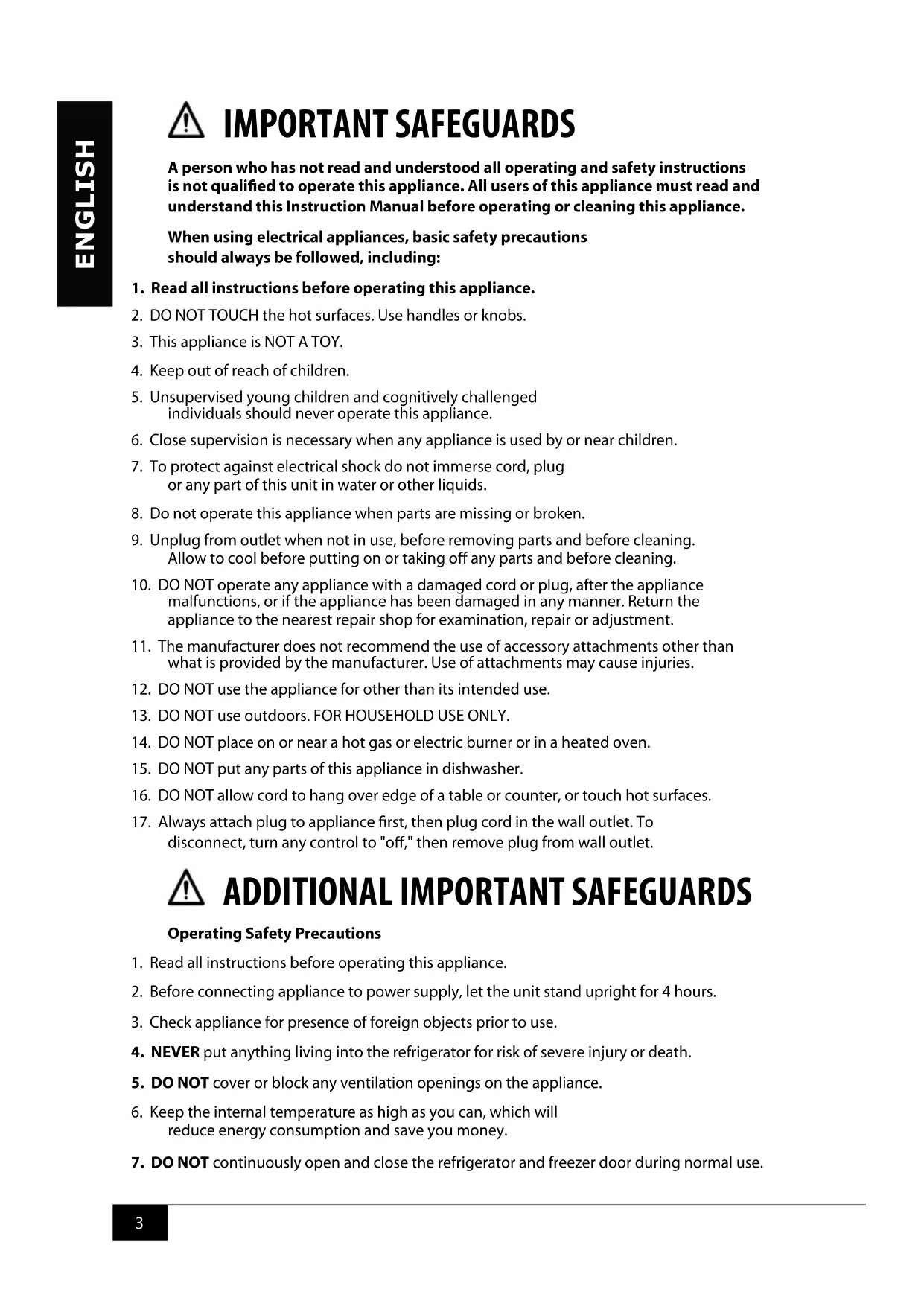 7. DO NOT continuously open and close the refrigerator and freezer door during normal use.ENGLISH