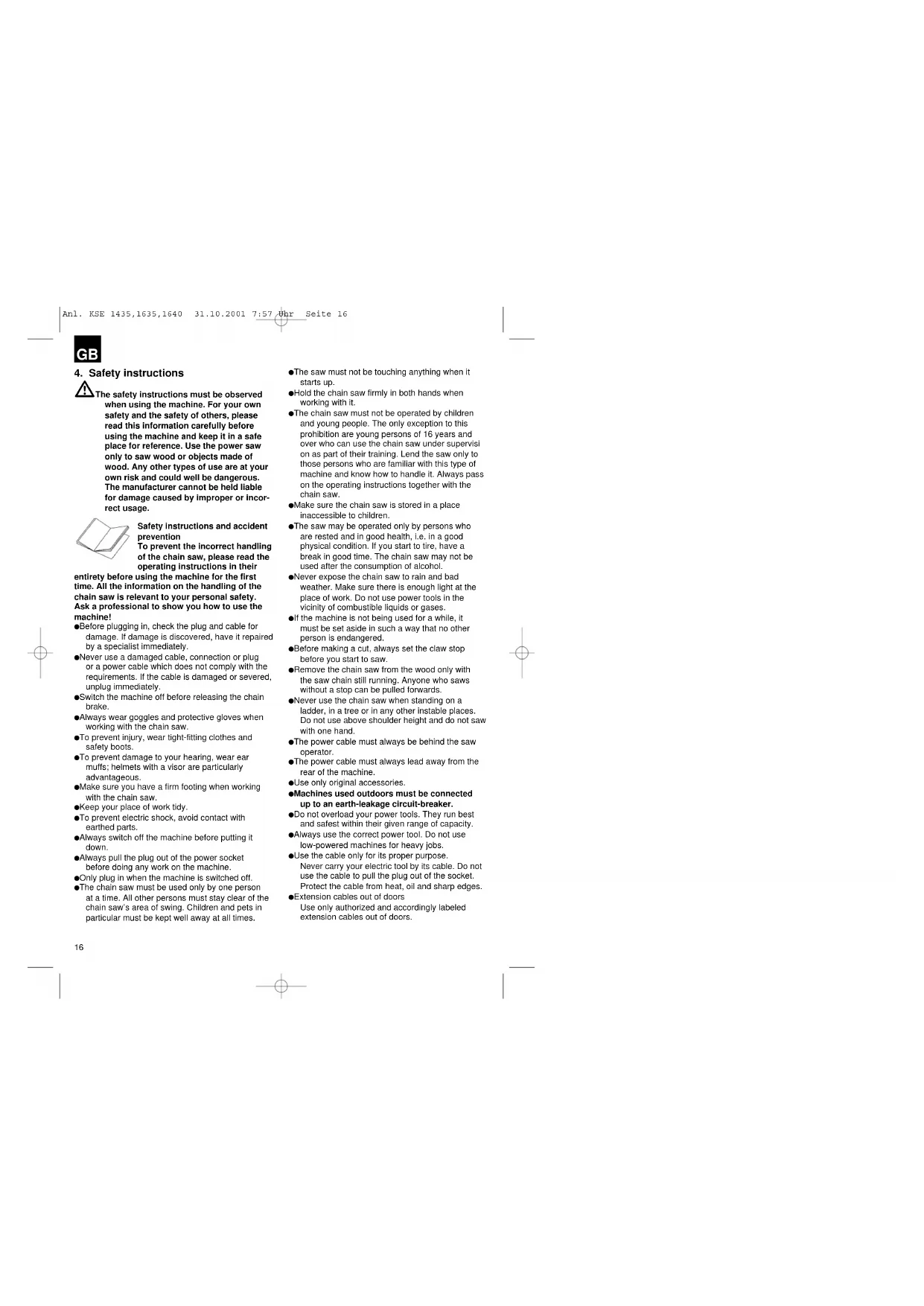 Anl. KSE 1435,1635,1640 31.10.2001 7:57 Uhr Seite 154. Safety instructions The safety instructions must be observed when using the machine. For your own safety and the safety of others, please read this information carefully before using the machine and keep it in a safe place for reference. Use the power saw only to saw wood or objects made of wood. Any other types of use are at your own risk and could well be dangerous. The manufacturer cannot be held liable for damage caused by improper or incor- rect usage. Safety instructions and accident prevention To prevent the incorrect handling of the chain saw, please read the operating instructions in their entirety before using the machine for the first time. All the information on the handling of the chain saw is relevant to your personal safety. Ask a professional to show you how to use the machine! Before plugging in, check the plug and cable for damage. If damage is discovered, have it repaired by a specialist immediately. Never use a damaged cable, connection or plug or a power cable which does not comply with the requirements. If the cable is damaged or severed, unplug immediately. Switch the machine off before releasing the chain brake. Always wear goggles and protective gloves when working with the chain saw. To prevent injury, wear tight-fitting clothes and safety boots. To prevent damage to your hearing, wear ear muffs; helmets with a visor are particularly advantageous. Make sure you have a firm footing when working with the chain saw. Keep your place of work tidy. To prevent electric shock, avoid contact with earthed parts. Always switch off the machine before putting it down. Always pull the plug out of the power socket before doing any work on the machine. Only plug in when the machine is switched off. The chain saw must be used only by one person at a time. All other persons must stay clear of the chain saw’s area of swing. Children and pets in particular must be kept well away at all times. The saw must not be touching anything when it starts up. Hold the chain saw firmly in both hands when working with it. The chain saw must not be operated by children and young people. The only exception to this prohibition are young persons of 16 years and over who can use the chain saw under supervisi on as part of their training. Lend the saw only to those persons who are familiar with this type of machine and know how to handle it. Always pass on the operating instructions together with the chain saw. Make sure the chain saw is stored in a place inaccessible to children. The saw may be operated only by persons who are rested and in good health, i.e. in a good physical condition. If you start to tire, have a break in good time. The chain saw may not be used after the consumption of alcohol. Never expose the chain saw to rain and bad weather. Make sure there is enough light at the place of work. Do not use power tools in the vicinity of combustible liquids or gases. If the machine is not being used for a while, it must be set aside in such a way that no other person is endangered. Before making a cut, always set the claw stop before you start to saw. Remove the chain saw from the wood only with the saw chain still running. Anyone who saws without a stop can be pulled forwards. Never use the chain saw when standing on a ladder, in a tree or in any other instable places. Do not use above shoulder height and do not saw with one hand. The power cable must always be behind the saw operator. The power cable must always lead away from the rear of the machine. Use only original accessories. Machines used outdoors must be connected up to an earth-leakage circuit-breaker. Do not overload your power tools. They run best and safest within their given range of capacity. Always use the correct power tool. Do not use low-powered machines for heavy jobs. Use the cable only for its proper purpose. Never carry your electric tool by its cable. Do not use the cable to pull the plug out of the socket. Protect the cable from heat, oil and sharp edges. Extension cables out of doors Use only authorized and accordingly labeled extension cables out of doors.