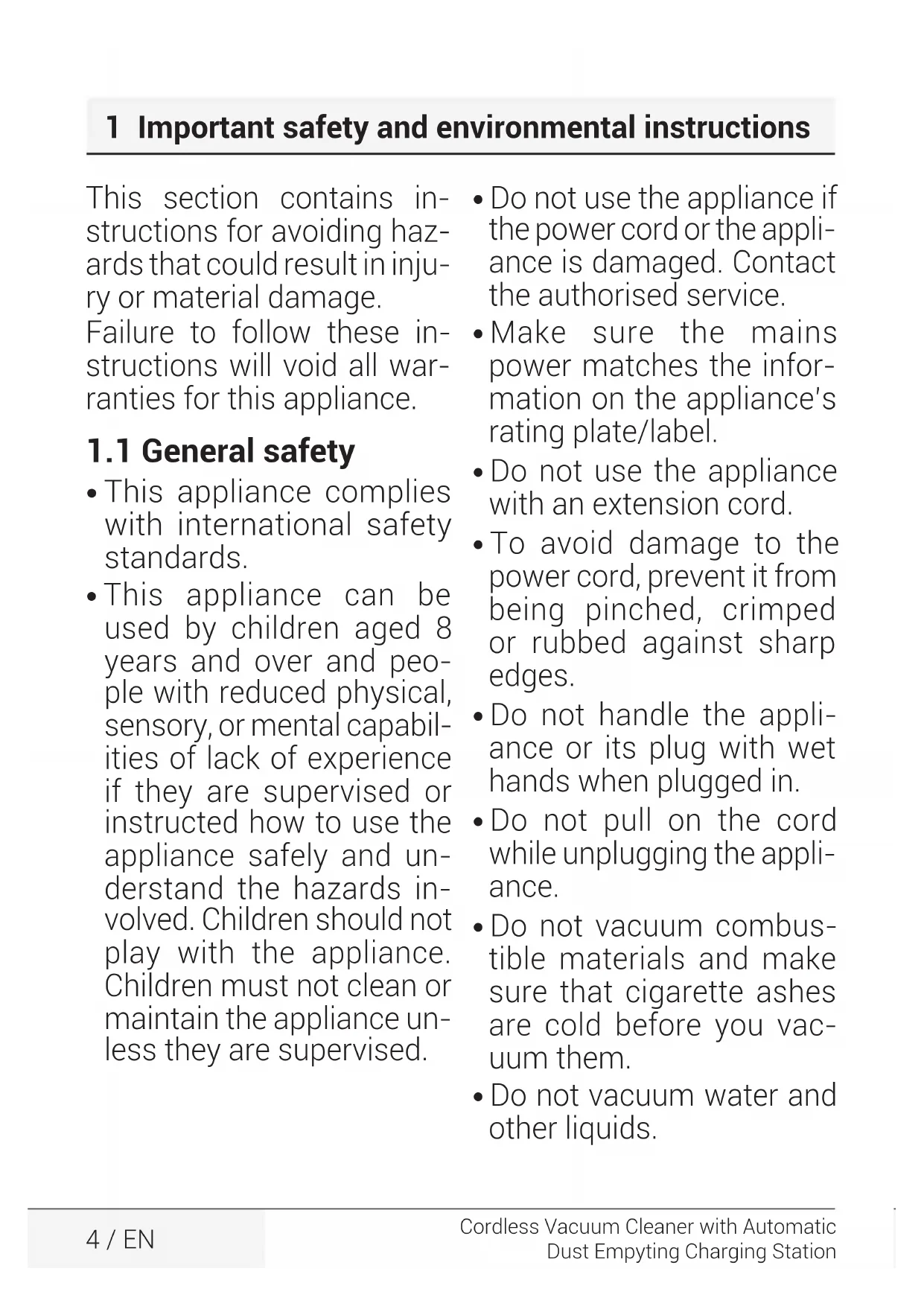 - Do not vacuum water and other liquids. 1 Important safety and environmental instructionsCordless Vacuum Cleaner with Automatic Dust Empyting Charging Station 5 / EN