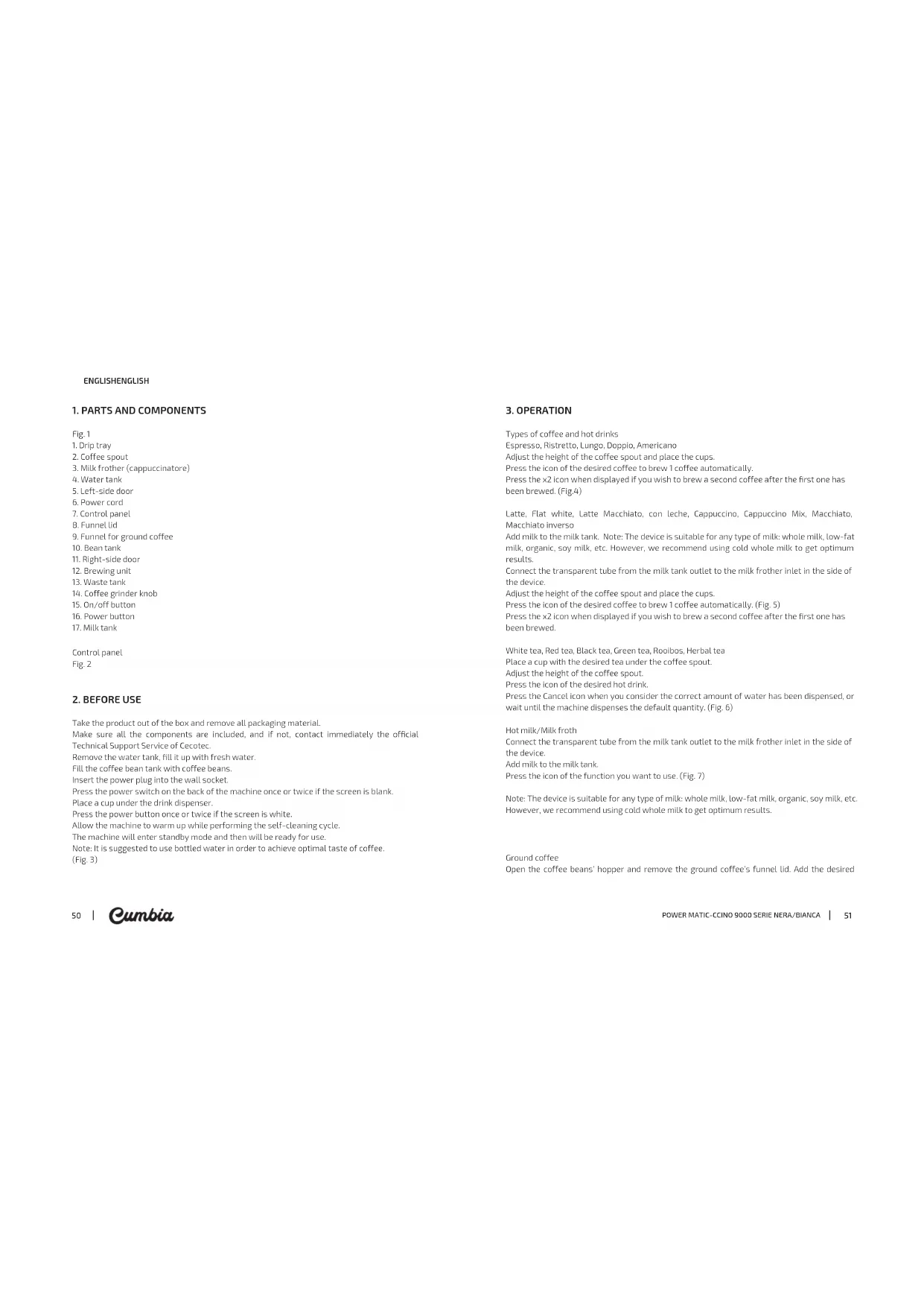 SAFETY INSTRUCTIONS Read these instructions thoroughly before using the appliance. Keep this instruction manual for future reference or new users. Make sure that the mains voltage matches the voltage stated on the rating label of the appliance and that the outlet is grounded. This appliance is intended for domestic use only. Place the appliance on a safe, at and stable surface, close to a socket with ground connection. Do not immerse the cord, plug, or any non-removable part of the appliance in water or any other liquid, nor expose the electrical connections to water. Make sure your hands are dry before handling the plug or switching on the appliance. Check the power cord regularly for visible damage. If the cord is damaged, it must be replaced by the ofcial Technical Support Service of Cecotec, in order to avoid any type of danger. Do not twist, bend, strain, or damage the power cord in any way. Protect it from sharp edges and heat sources. Do not let it touch hot surfaces. Do not let the power cord hang over the edge of table or counter top. Do not let any electric parts to make contact with water. Do not use the product outdoors, close to electric plates, gas, ames or inside an oven. Do not expose the appliance to temperatures below 0. The use of accessories not recommended by the product’s manufacturer may cause risk of re, electric shock or other damages. Do not use hot water to ll the water tank, use natural water at room temperature. Make sure your hands are dry before handling the plug or switching on the appliance. Do not pull the wire for moving or transporting the appliance. Do not use any caramel-coated coffee bean or nay other avour. Do not point the steam nor the hot water at yourself or anyone to avoid scalds. The appliance will be very hot during and immediately after being used. Use handles, gloves or other convenient protection accessories in order to avoid burns and injuries. Do not remove the drip tray during operation, as hot water may cause damage to the machine, and place an empty cup under the dispensing spout when the machine is turned on or off. In case of re, use CO2 extinguishers. Do not use water or dry powder extinguishers. Do not operate the product empty. Make sure there is enough water inside the device before using it. The appliance is not intended to be used by children under the age of 8. It can be used by children over the age of 8, as long as they are given continuous supervision. This appliance is not intended to be used by persons with reduced physical, sensory, or mental capabilities, or lack of experience or knowledge, unless they have been given supervision or instruction concerning the use of the appliance in a safe way by a person responsible for their safety, and understand the hazards involved. Supervise young children to make sure that they do not play with the appliance. Close supervision is necessary when the appliance is being used by or near children. This product has undergone a quality control previous to its commercialisation with the aim of ensuring its correct operating. After the quality control testing, the appliance is cleaned thoroughly, therefore, there could be rests of water drops or coffee in its inner parts.2322