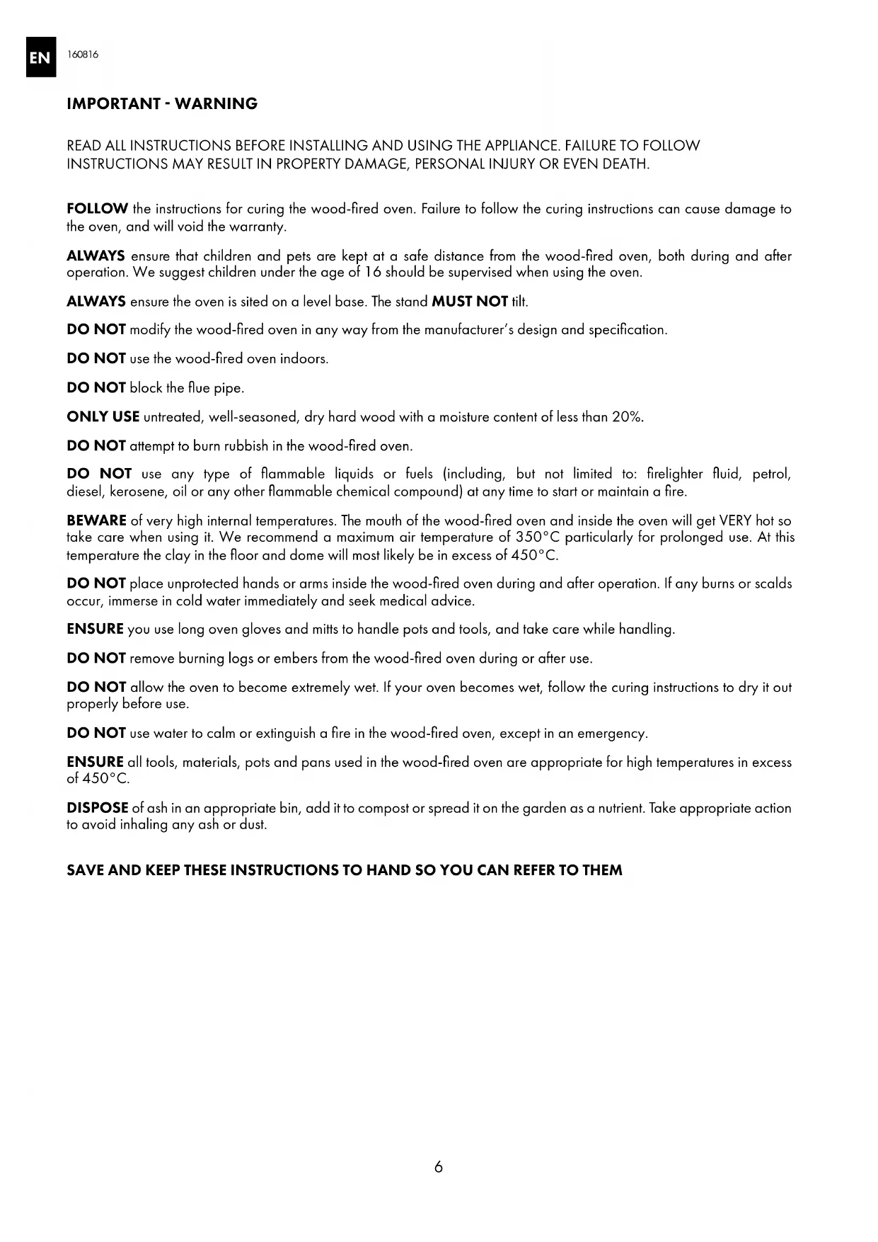 READ ALL INSTRUCTIONS BEFORE INSTALLING AND USING THE APPLIANCE FAILURE TO FOLLOW INSTRUCTIONS MAY RESULT IN PROPERTY DAMAGE, PERSONAL INJURY OR EVEN DEATH FOLLOW the instructions for curing the wood-fired oven Failure to follow the curing instructions can cause damage to the oven, and will void the warranty ALWAYS ensure that children and pets are kept at a safe distance from the wood-fired oven, both during and after operation We suggest children under the age of 16 should be supervised when using the oven ALWAYS ensure the oven is sited on a level base The stand MUST NOT tilt DO NOT modify the wood-fired oven in any way from the manufacturer’s design and specification DO NOT use the wood-fired oven indoors DO NOT block the flue pipe ONLY USE untreated, well-seasoned, dry hard wood with a moisture content of less than 20% DO NOT attempt to burn rubbish in the wood-fired oven DO NOT use any type of flammable liquids or fuels (including, but not limited to: firelighter fluid, petrol, diesel, kerosene, oil or any other flammable chemical compound) at any time to start or maintain a fire BEWARE of very high internal temperatures The mouth of the wood-fired oven and inside the oven will get VERY hot so take care when using it We recommend a maximum air temperature of 350°C particularly for prolonged use At this temperature the clay in the floor and dome will most likely be in excess of 450°C DO NOT place unprotected hands or arms inside the wood-fired oven during and after operation If any burns or scalds occur, immerse in cold water immediately and seek medical advice ENSURE you use long oven gloves and mitts to handle pots and tools, and take care while handling DO NOT remove burning logs or embers from the wood-fired oven during or after use DO NOT allow the oven to become extremely wet If your oven becomes wet, follow the curing instructions to dry it out properly before use DO NOT use water to calm or extinguish a fire in the wood-fired oven, except in an emergency ENSURE all tools, materials, pots and pans used in the wood-fired oven are appropriate for high temperatures in excess of 450°C DISPOSE of ash in an appropriate bin, add it to compost or spread it on the garden as a nutrient Take appropriate action to avoid inhaling any ash or dust SAVE AND KEEP THESE INSTRUCTIONS TO HAND SO YOU CAN REFER TO THEM