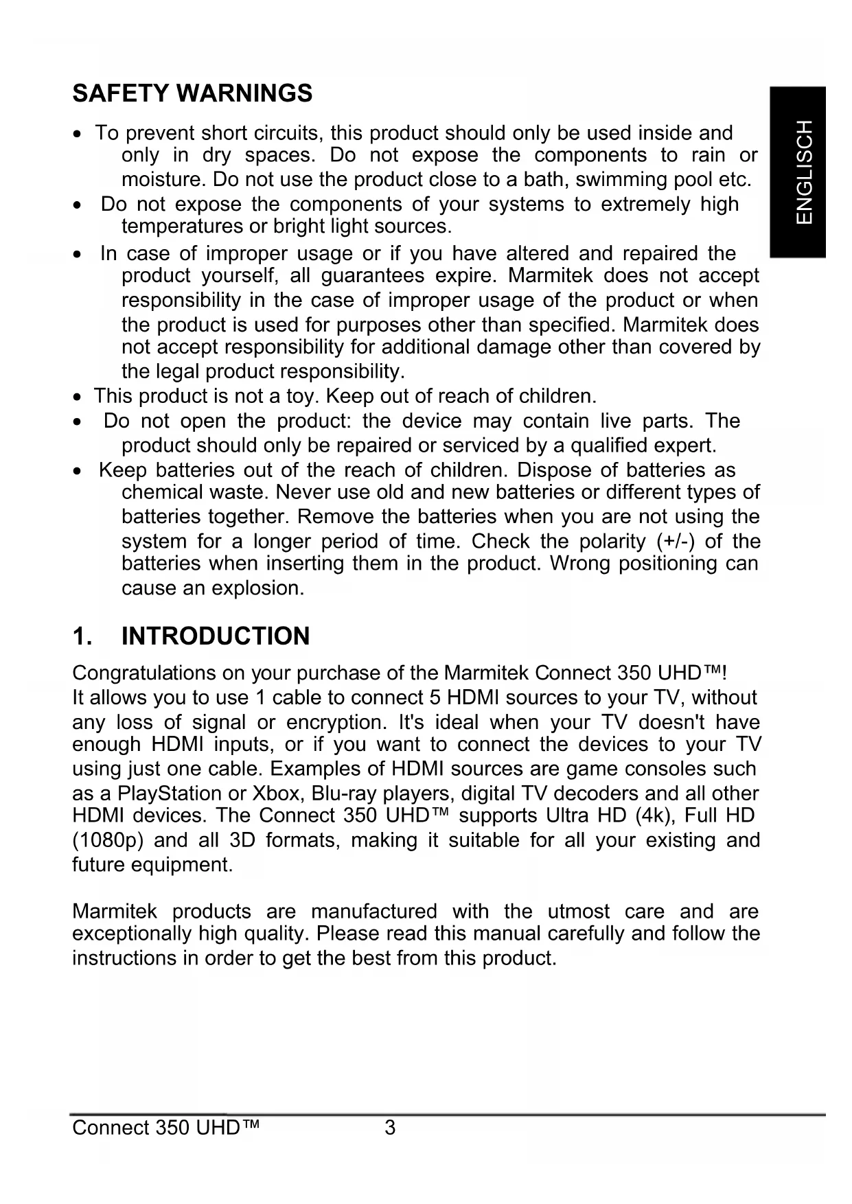 Congratulations on your purchase of the Marmitek Connect 350 UHD™! It allows you to use 1 cable to connect 5 HDMI sources to your TV, without any loss of signal or encryption. It's ideal when your TV doesn't have enough HDMI inputs, or if you want to connect the devices to your TV using just one cable. Examples of HDMI sources are game consoles such as a PlayStation or Xbox, Blu-ray players, digital TV decoders and all other HDMI devices. The Connect 350 UHD™ supports Ultra HD (4k), Full HD (1080p) and all 3D formats, making it suitable for all your existing and future equipment. Marmitek products are manufactured with the utmost care and are exceptionally high quality. Please read this manual carefully and follow the instructions in order to get the best from this product.4 © MARMITEK