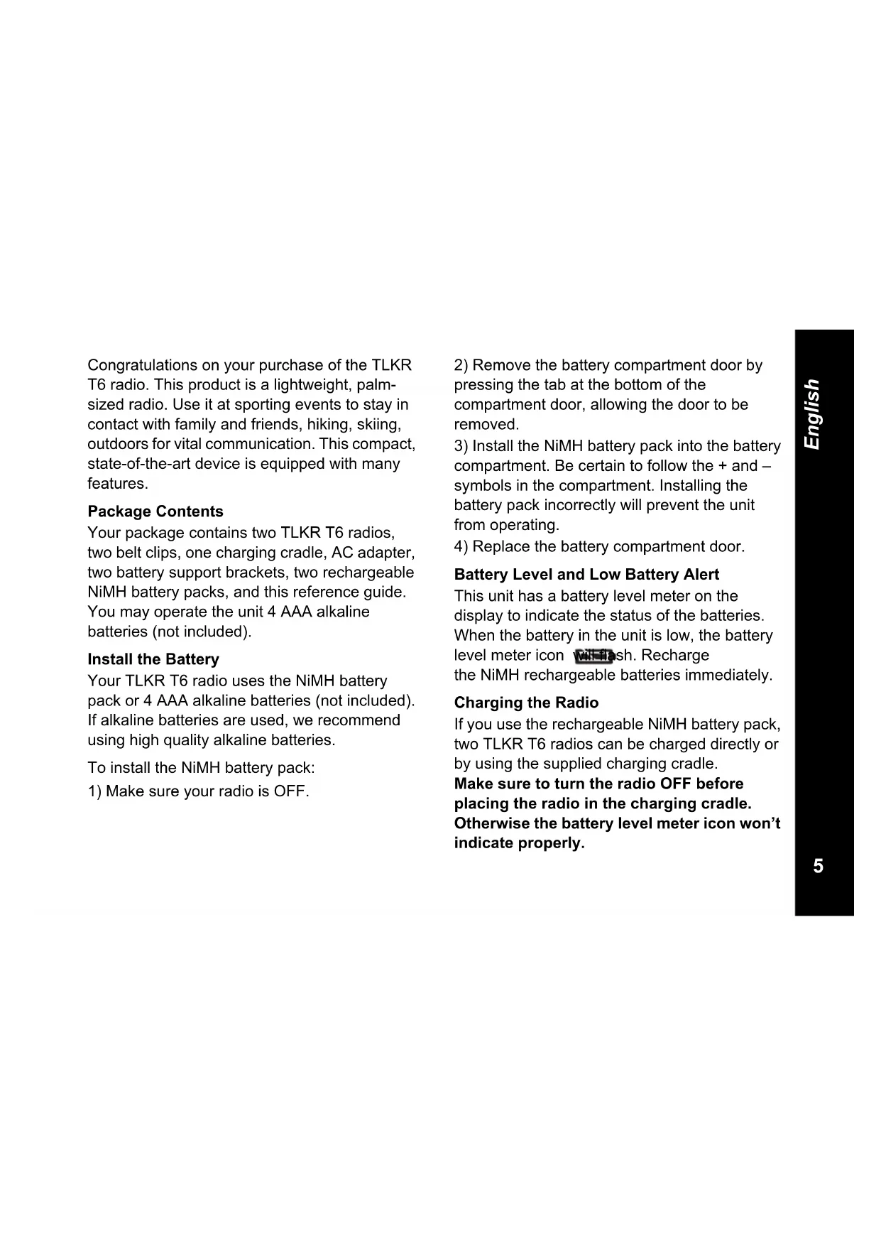 MOTO 7794.book Page 4 Tuesday, June 29, 2010 3:16 PM5 English Congratulations on your purchase of the TLKR T6 radio. This product is a lightweight, palm- sized radio. Use it at sporting events to stay in contact with family and friends, hiking, skiing, outdoors for vital communication. This compact, state-of-the-art device is equipped with many features. Package Contents Your package contains two TLKR T6 radios, two belt clips, one charging cradle, AC adapter, two battery support brackets, two rechargeable NiMH battery packs, and this reference guide. You may operate the unit 4 AAA alkaline batteries (not included). Install the Battery Your TLKR T6 radio uses the NiMH battery pack or 4 AAA alkaline batteries (not included). If alkaline batteries are used, we recommend using high quality alkaline batteries. To install the NiMH battery pack: