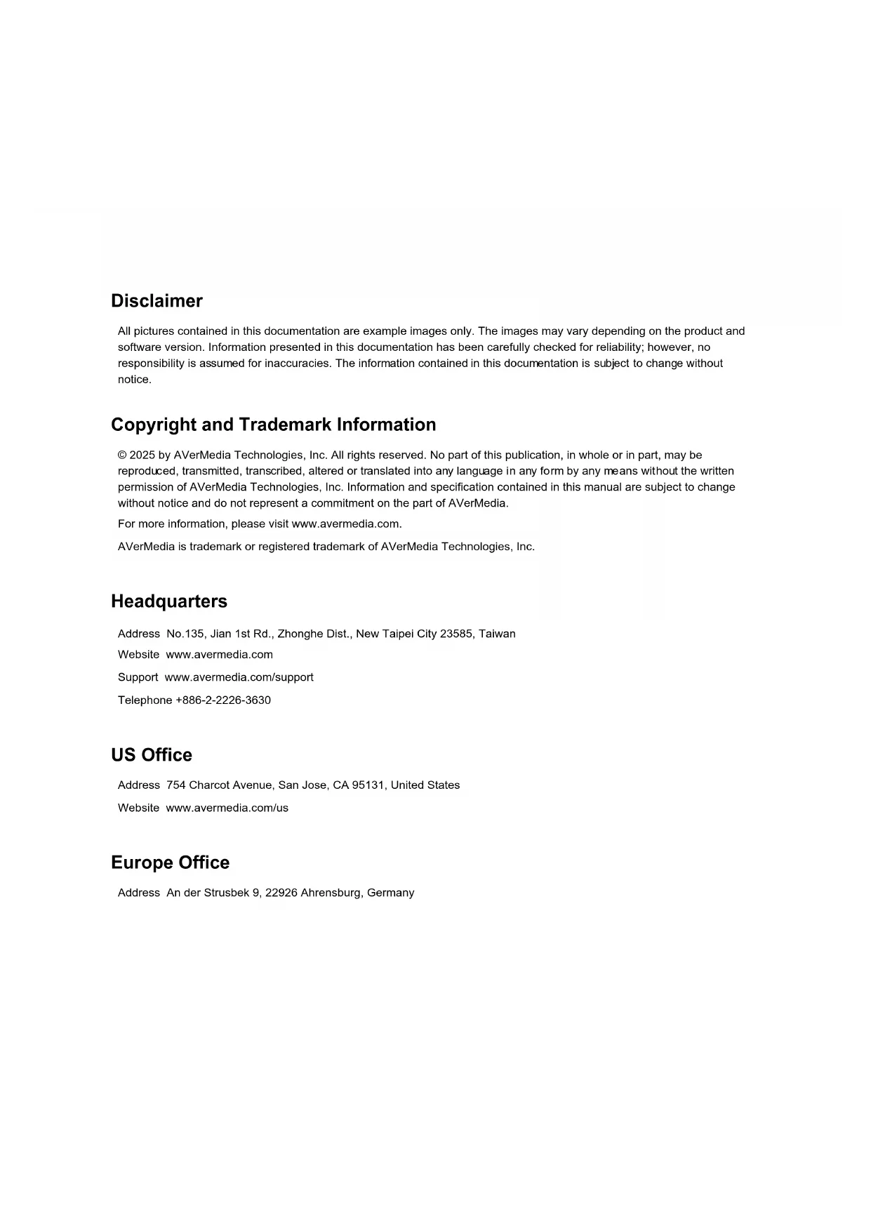 Slovenský Magyar Slovenščina Polski Česky БългарскиDisclaimer All pictures contained in this documentation are example images only. The images may vary depending on the product and software version. Information presented in this documentation has been carefully checked for reliability; however, no responsibility is assumed for inaccuracies. The information contained in this documentation is subject to change without notice. Copyright and Trademark Information © 2025 by AVerMedia Technologies, Inc. All rights reserved. No part of this publication, in whole or in part, may be reproduced, transmitted, transcribed, altered or translated into any language in any form by any means without the written permission of AVerMedia Technologies, Inc. Information and specification contained in this manual are subject to change without notice and do not represent a commitment on the part of AVerMedia. For more information, please visit www.avermedia.com. AVerMedia is trademark or registered trademark of AVerMedia Technologies, Inc. Headquarters Address No.135, Jian 1st Rd., Zhonghe Dist., New Taipei City 23585, Taiwan Website www.avermedia.com Support www.avermedia.com/support Telephone +886-2-2226-3630 US Office Address 754 Charcot Avenue, San Jose, CA 95131, United States Website www.avermedia.com/us Europe Office Address An der Strusbek 9, 22926 Ahrensburg, GermanyFederal Communications Commission Statement Class B This device complies with Part 15 of the FCC Rules. Operation is subject to the following two conditions: (1) this device may not cause harmful interference, and (2) this device must accept any interference received, including interference that may cause undesired operation. NOTE - This equipment has been tested and found to comply with the limits for a Class B digital device, pursuant to Part 15 of the FCC Rules. These limits are designed to provide reasonable protection against harmful interference in a residential installation. This equipment generates, uses and can radiate radio frequency energy and, if not installed and used in accordance with the instructions, may cause harmful interference to radio communications. However, there is no guarantee that interference will not occur in a particular installation. If this equipment does cause harmful interference to radio or television reception, which can be determined by tuning the equipment off and on, the user is encouraged to try to correct the interference by one or more of the following measures: