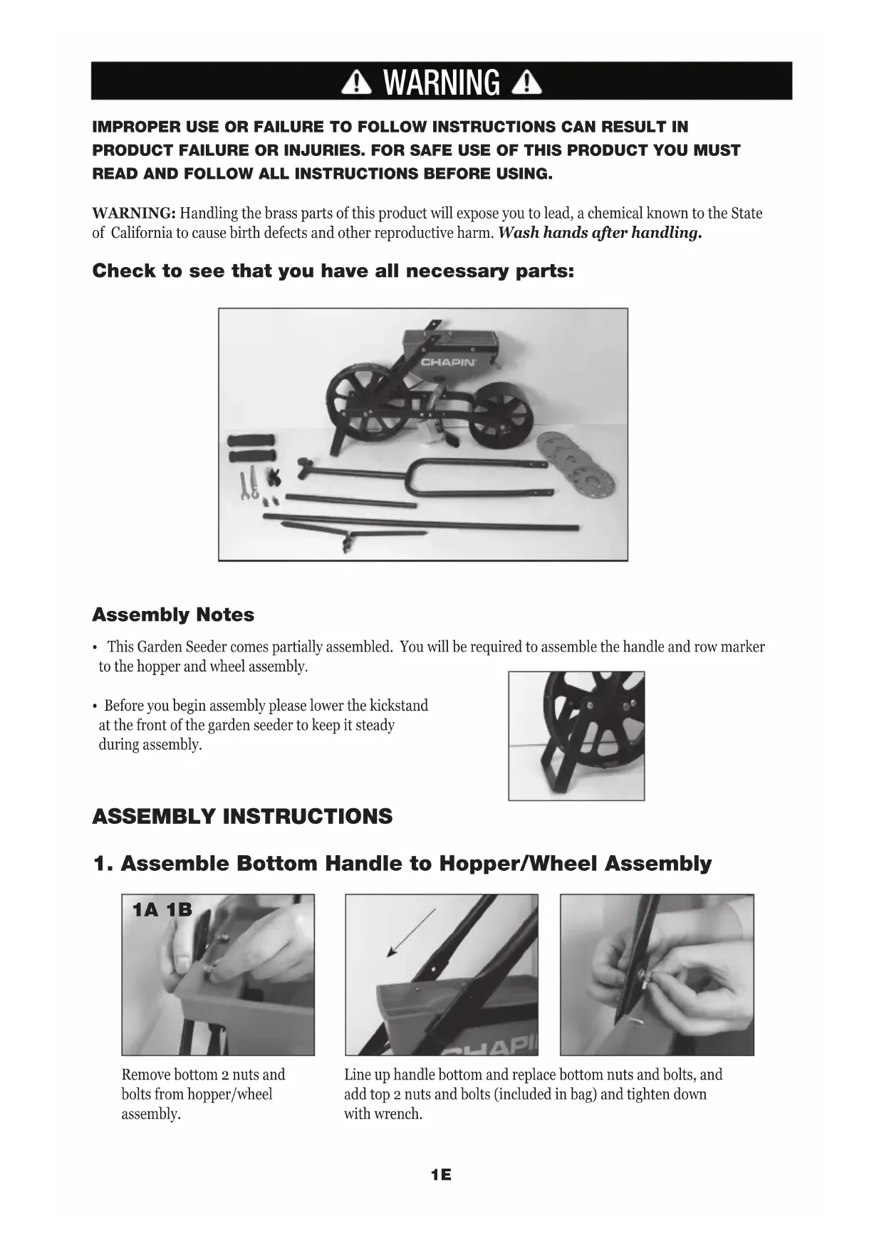 Remove bottom 2 nuts and bolts from hopper/wheel assembly. 1A 1B Line up handle bottom and replace bottom nuts and bolts, and add top 2 nuts and bolts (included in bag) and tighten down with wrench. Check to see that you have all necessary parts:2. Assemble Handle Cross Bar