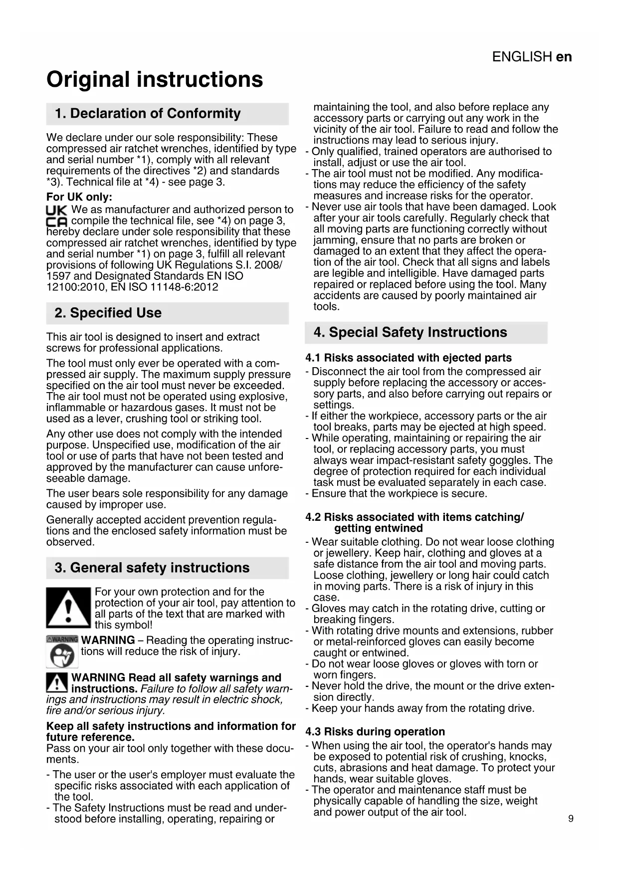 Original instructions We declare under our sole responsibility: These compressed air ratchet wrenches, identified by type and serial number *1), comply with all relevant requirements of the directives *2) and standards *3). Technical file at *4) - see page 3. For UK only: We as manufacturer and authorized person to compile the technical file, see *4) on page 3, hereby declare under sole responsibility that these compressed air ratchet wrenches, identified by type and serial number *1) on page 3, fulfill all relevant provisions of following UK Regulations S.I. 2008/ 1597 and Designated Standards EN ISO