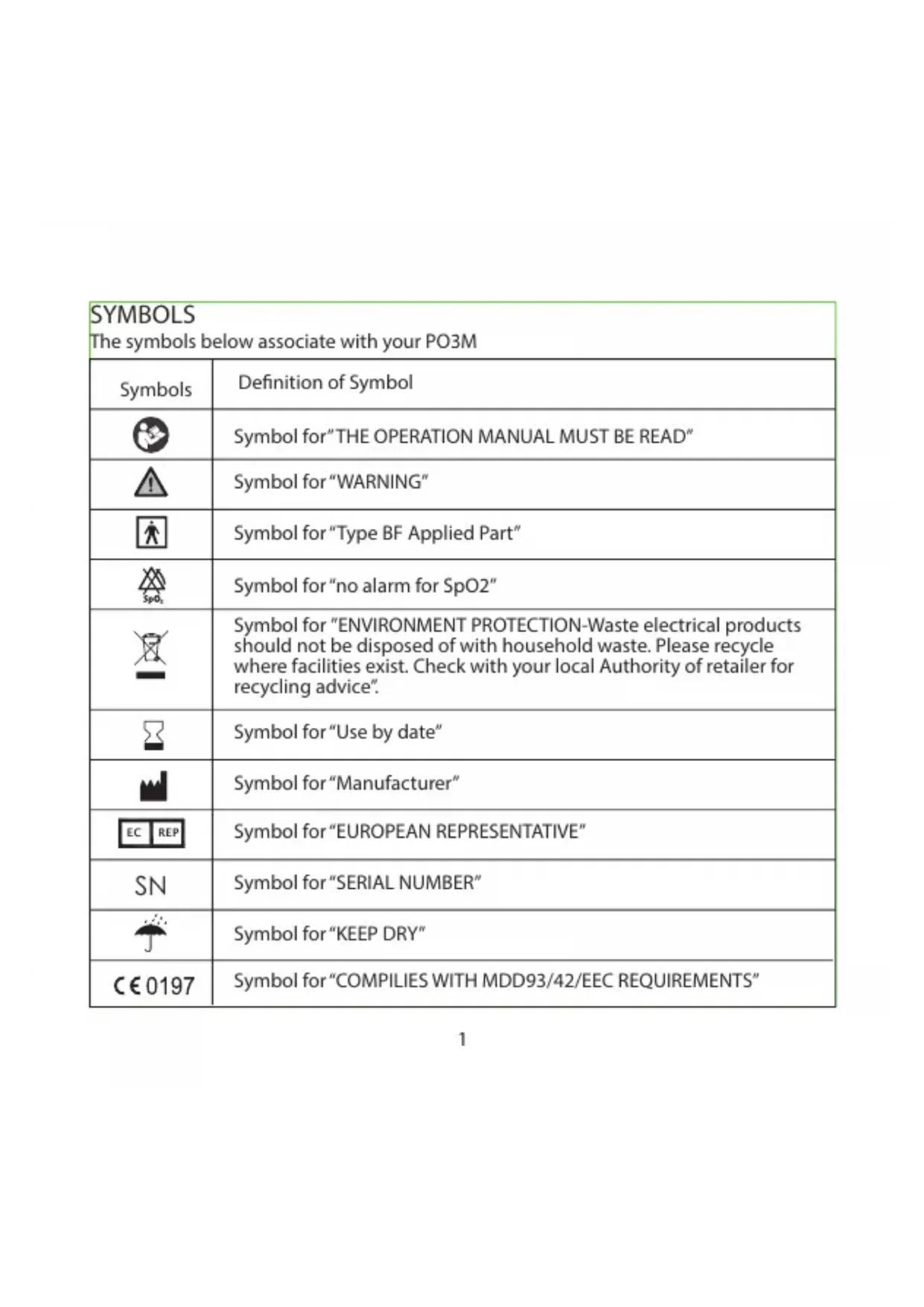 | SYMBOLS The symbols below associate with your PO3M | |