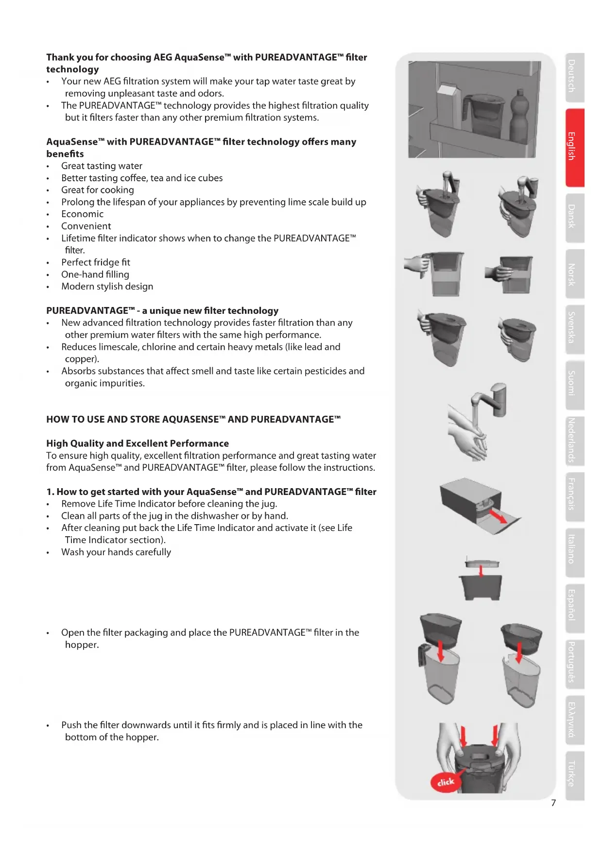 - Before using the AquaSense™ jug you need to activate the PUREADVANTAGE™ lter in the following way o Place the jug under the tap and lter 2 litres of water. o Discard the ltered water before start using the jug. Filter through 2 litres of water