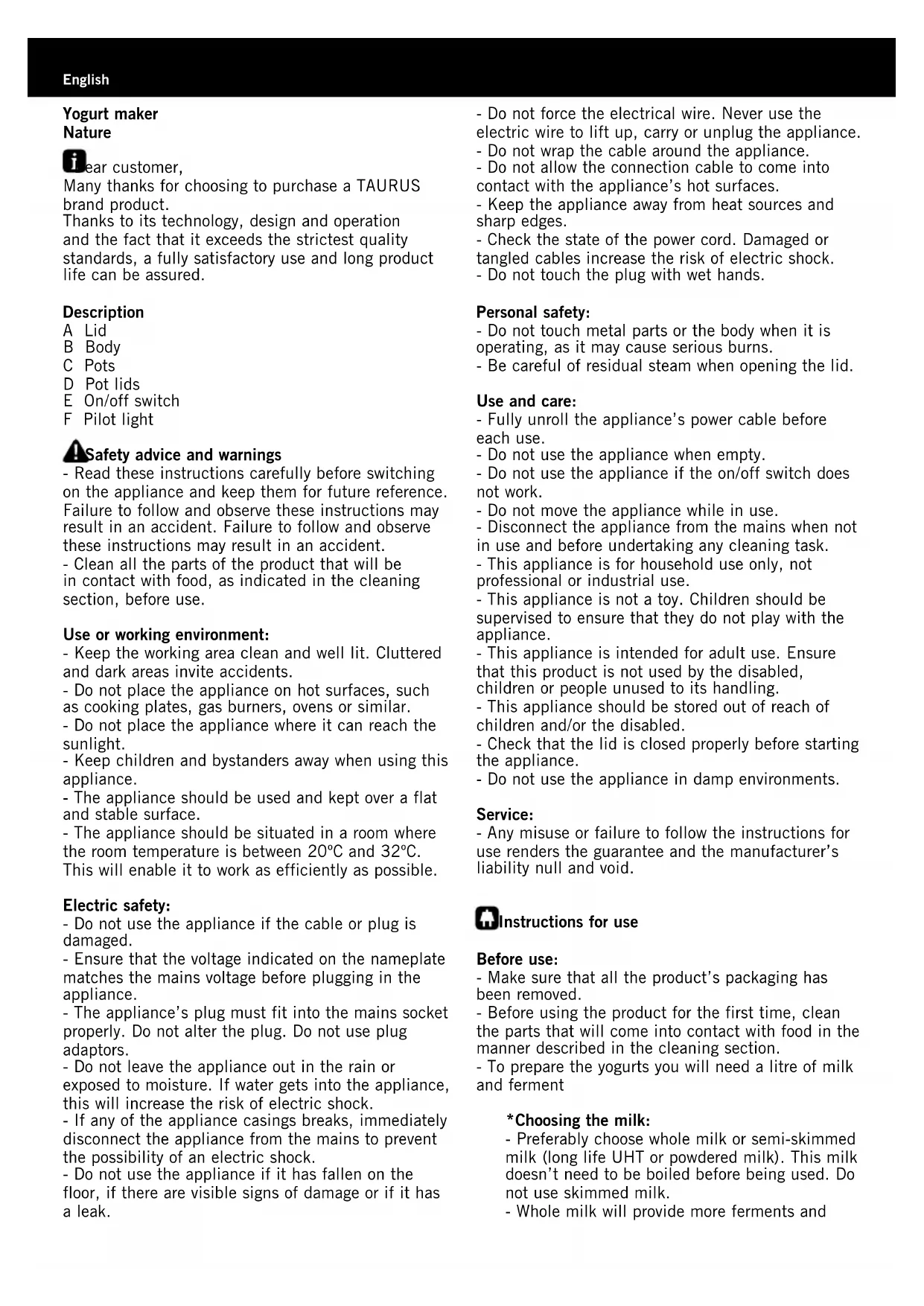 - 4 cullerades soperes de melmelada. Buideu el iogurt o el ferment en un recipient. Afegiu el xarop i aboqueu a poc a poc la llet sense deixar de remenar la preparació. Buideu la barreja als pots. Buideu el iogurt o el ferment en un recipient i barregeu amb la llet. Aboqueu la barreja als pots. Talleu les rodanxes en daus i distribuïu-los en els pots. Buideu el iogurt o ferment en un recipient, afegiu a poc a poc la llet i el suc. Aboqueu la barreja als pots. Variants: també podeu utilitzar maduixes (10 unitats), mandarines (4 unitats), taronja (1 unitat), plàtan (1 unitat). Buideu la xocolata o xicoira en un recipient, afegiu amb cura un got de llet tèbia i barregeu, afegiu el iogurt o ferment i la resta de la llet sense deixar de barrejar. Buideu la barreja als pots. Barregeu la melmelada amb una mica de llet en un recipient, buideu el iogurt o el ferment i barregeu, afegiu-hi la resta de la llet i torneu a barrejar. Buideu la barreja als pots. RECEPTESYogurtmaker Nature Dear customer, Many thanks for choosing to purchase a TAURUS brand product. Thanks to its technology, design and operation and the fact that it exceeds the strictest quality standards, a fully satisfactory use and long product life can be assured. Description A Lid B Body C Pots D Pot lids E On/off switch F Pilot light Safetyadviceandwarnings - Read these instructions carefully before switching on the appliance and keep them for future reference. Failure to follow and observe these instructions may result in an accident. Failure to follow and observe these instructions may result in an accident. - Clean all the parts of the product that will be in contact with food, as indicated in the cleaning section, before use. Useorworkingenvironment: - Keep the working area clean and well lit. Cluttered and dark areas invite accidents. - Do not place the appliance on hot surfaces, such as cooking plates, gas burners, ovens or similar. - Do not place the appliance where it can reach the sunlight. - Keep children and bystanders away when using this appliance. - The appliance should be used and kept over a flat and stable surface. - The appliance should be situated in a room where the room temperature is between 20ºC and 32ºC. This will enable it to work as efficiently as possible. Electricsafety: - Do not use the appliance if the cable or plug is damaged. - Ensure that the voltage indicated on the nameplate matches the mains voltage before plugging in the appliance. - The appliance’s plug must fit into the mains socket properly. Do not alter the plug. Do not use plug adaptors. - Do not leave the appliance out in the rain or exposed to moisture. If water gets into the appliance, this will increase the risk of electric shock. - If any of the appliance casings breaks, immediately disconnect the appliance from the mains to prevent the possibility of an electric shock. - Do not use the appliance if it has fallen on the floor, if there are visible signs of damage or if it has a leak. - Do not force the electrical wire. Never use the electric wire to lift up, carry or unplug the appliance. - Do not wrap the cable around the appliance. - Do not allow the connection cable to come into contact with the appliance’s hot surfaces. - Keep the appliance away from heat sources and sharp edges. - Check the state of the power cord. Damaged or tangled cables increase the risk of electric shock. - Do not touch the plug with wet hands. Personalsafety: - Do not touch metal parts or the body when it is operating, as it may cause serious burns. - Be careful of residual steam when opening the lid. Useandcare: - Fully unroll the appliance’s power cable before each use. - Do not use the appliance when empty. - Do not use the appliance if the on/off switch does not work. - Do not move the appliance while in use. - Disconnect the appliance from the mains when not in use and before undertaking any cleaning task. - This appliance is for household use only, not professional or industrial use. - This appliance is not a toy. Children should be supervised to ensure that they do not play with the appliance. - This appliance is intended for adult use. Ensure that this product is not used by the disabled, children or people unused to its handling. - This appliance should be stored out of reach of children and/or the disabled. - Check that the lid is closed properly before starting the appliance. - Do not use the appliance in damp environments. Service: - Any misuse or failure to follow the instructions for use renders the guarantee and the manufacturer’s liability null and void. Instructionsforuse Beforeuse: - Make sure that all the product’s packaging has been removed. - Before using the product for the first time, clean the parts that will come into contact with food in the manner described in the cleaning section. - To prepare the yogurts you will need a litre of milk and ferment *Choosingthemilk: - Preferably choose whole milk or semi-skimmed milk (long life UHT or powdered milk). This milk doesn’t need to be boiled before being used. Do not use skimmed milk. - Whole milk will provide more ferments and Englisharomas. - Fresh or pasteurised milk must be boiled previously. They should be left to cool and the cream removed. These types of milk contain more vitamins and dietary minerals. - To obtain thicker yogurts, add 2 or 3 dessert spoons of powdered milk. - Use the milk at room temperature or heat it slightly (37ºC – 40ºC). *Choosingtheferment Choose: A - Use a yogurt (preferably whole milk yogurt) with an expiration date as far in advance as possible. B - Use freeze-dried ferment (it can be purchased in supermarkets, pharmacies or specialist shops). Respect the activation time recommended on the ferment instructions. C - Use the yogurt that you have made yourself. Do not use it more than 5 times. Preparingtheyogurt - Carefully mix a litre of milk with the ferment. To obtain a homogenous mix, beat the yogurt until the mixture is smooth. Then 