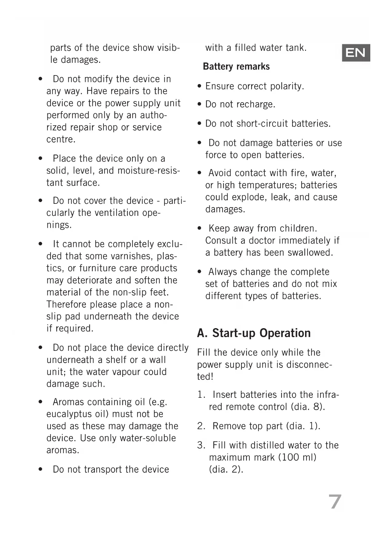 - Always change the complete set of batteries and do not mix different types of batteries. A. Start-up Operation Fill the device only while the power supply unit is disconnec- ted!