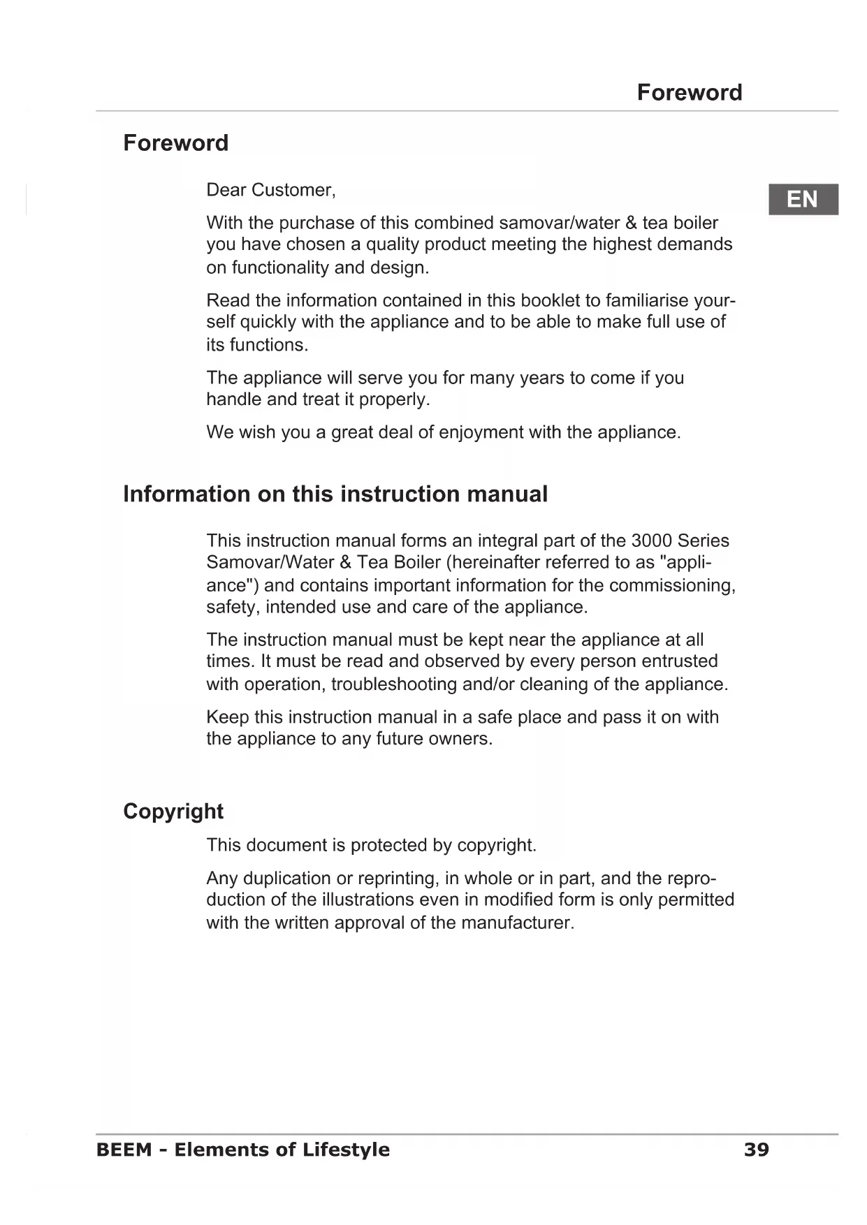 Foreword Dear Customer, With the purchase of this combined samovar/water & tea boiler you have chosen a quality product meeting the highest demands on functionality and design. Read the information contained in this booklet to familiarise your- self quickly with the appliance and to be able to make full use of its functions. The appliance will serve you for many years to come if you handle and treat it properly. We wish you a great deal of enjoyment with the appliance. Information on this instruction manual This instruction manual forms an integral part of the 3000 Series Samovar/Water & Tea Boiler (hereinafter referred to as "appli- ance") and contains important information for the commissioning, safety, intended use and care of the appliance. The instruction manual must be kept near the appliance at all times. It must be read and observed by every person entrusted with operation, troubleshooting and/or cleaning of the appliance. Keep this instruction manual in a safe place and pass it on with the appliance to any future owners. Copyright This document is protected by copyright. Any duplication or reprinting, in whole or in part, and the repro- duction of the illustrations even in modied form is only permitted with the written approval of the manufacturer.40 Information on this instruction manual BEEM - Elements of Lifestyle