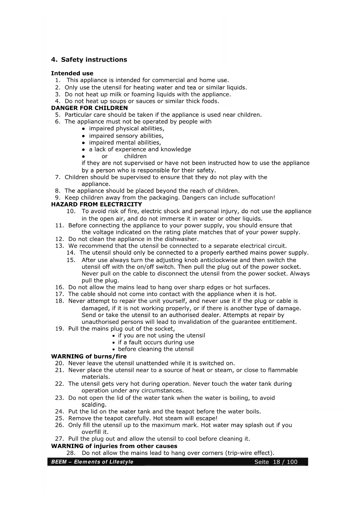 This appliance is equipped with various safety features. Nevertheless please read this instruction carefully and use the appliance only as described in this instruction manual, in order to avoid injuries or damage. Keep these instructions so you can refer to them. Should you give this appliance to anybody else, take care that you pass on the instructions as well. Safety terms in this instruction: The signal word DANGER advises against severe injuries or deadly peril. The signal word WARNING advises against injuries and severe damage to property. The signal word ATTENTION advises against light injuries or damages.BEEM – Elements of Lifestyle Seite 17 / 100