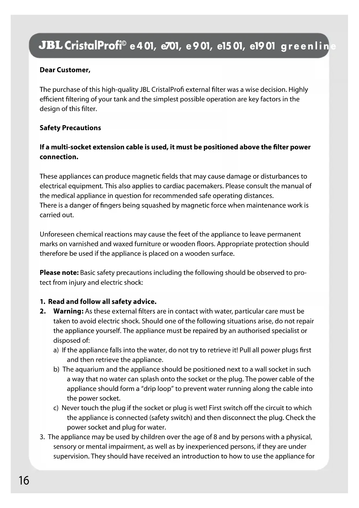e 4 01, e701, e 9 01, e15 01, e19 01 g r e e n l i n e Dear Customer, The purchase of this high-quality JBL CristalProfi external filter was a wise decision. Highly efficient filtering of your tank and the simplest possible operation are key factors in the design of this filter. Safety Precautions If a multi-socket extension cable is used, it must be positioned above the filter power connection. These appliances can produce magnetic fields that may cause damage or disturbances to electrical equipment. This also applies to cardiac pacemakers. Please consult the manual of the medical appliance in question for recommended safe operating distances. There is a danger of fingers being squashed by magnetic force when maintenance work is carried out. Unforeseen chemical reactions may cause the feet of the appliance to leave permanent marks on varnished and waxed furniture or wooden floors. Appropriate protection should therefore be used if the appliance is placed on a wooden surface. Please note: Basic safety precautions including the following should be observed to pro- tect from injury and electric shock: