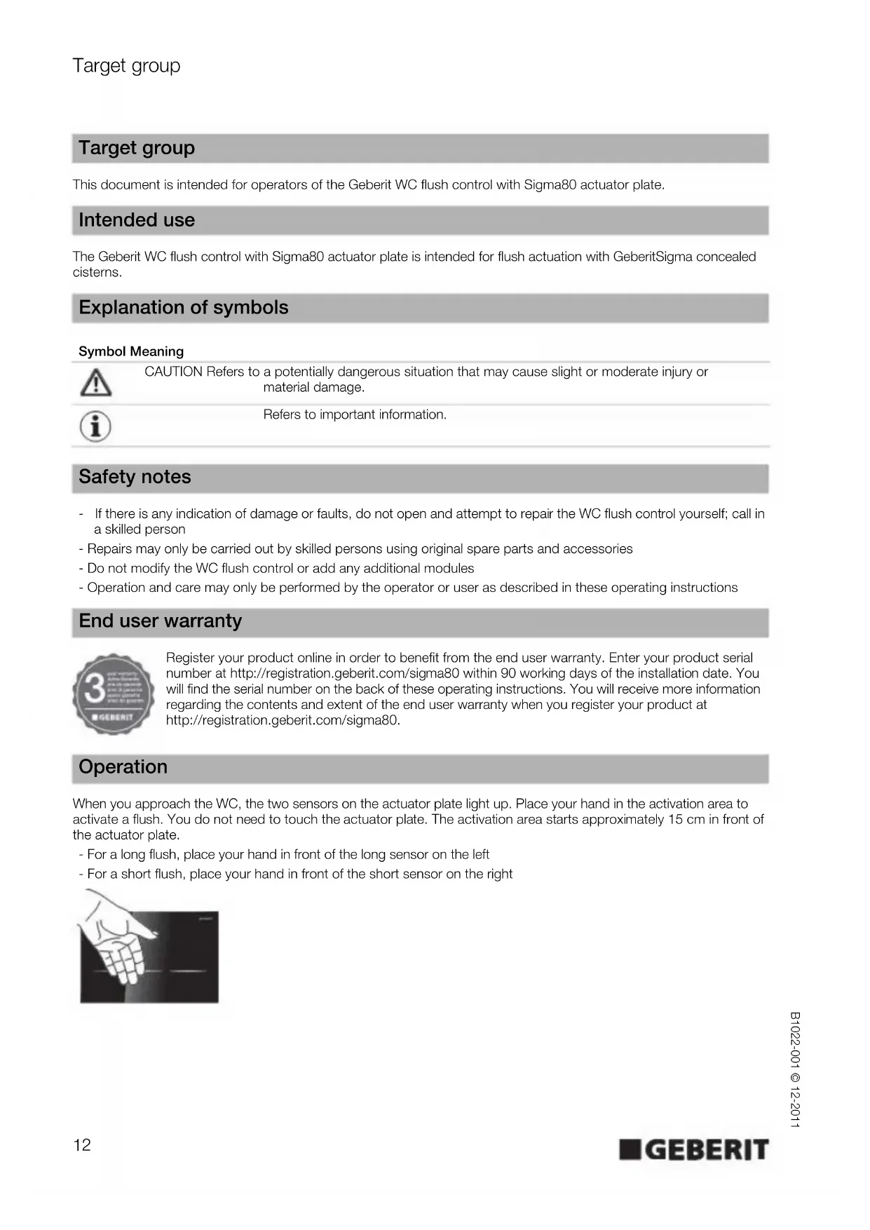 and goes off again when you step back Setting 3 D Activate or deactivate automatic flush actuation When the automatic flush actuation is activated, the WC flush control always activates a long flush when you step back after use. Manual actuation is not necessary. Setting 1 = deactivated Setting 2 = activated Setting 1 E Reset to factory setting Settings B, C and D are reset to the factory setting – Skilled persons will find information on the settings at www.geberit.com. Setting Description Factory setting Remarks Interval flush The WC flush control activates the flush at regular time intervals. Not active Adjustment range 1–168 h Flush volume for short flush The flush volume for a short flush can be set so that the optimum volume for the respective WC ceramic appliance is obtained. Level 3 Adjustment range 5 levels Detection time The minimum time for detecting a user within the detection range can be changed (relevant in the case of automatic flush actuation). 7 s Adjustment range 1–60 s Cleaning time The time span during which the WC flush control is inactive in the cleaning function can be changed. 3 min Adjustment range 1–30 min Sensor illumination detection distance The distance between the user and the actuator plate at which the sensor illumination is activated can be changed. Level 3 Adjustment range 5 levels14 Settings B1022-001 © 12-2011 A - Activating or deactivating the cleaning function The actuator plate and WC can be cleaned without triggering a flush. Prerequisites The WC flush control is ready for operation. If the sensors are not covered at the same time, a flush will be activated. Remove your hands and repeat the procedure.