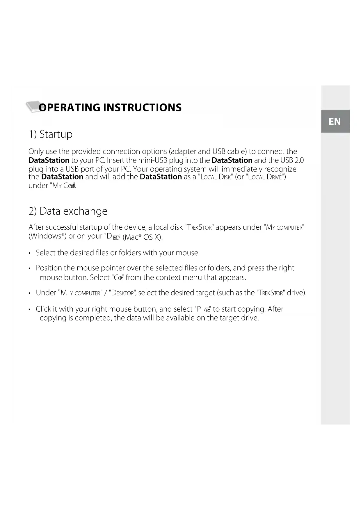 After successful startup of the device, a local disk "tr e k st o r " appears under "My c o M p u t e r " (Windows®) or on your "D e s k t o p " (Mac® OS X).
