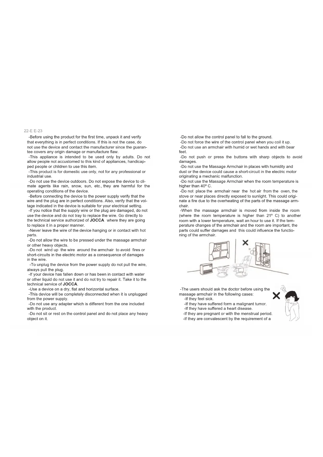 - When the massage armchair is moved from inside the room (where the room temperature is higher than 21^ ) to another room with a lower temperature, wait an hour to use it. If the temperature changes of the armchair and the room are important, the parts could suffer damages and this could influence the functioning of the armchair.