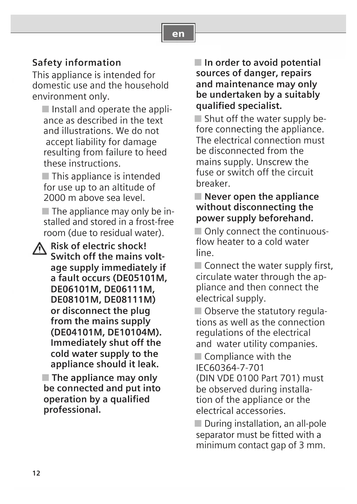 Safety information This appliance is intended for domestic use and the household environment only. ■ Install and operate the appli- ance as described in the text and illustrations. We do not accept liability for damage resulting from failure to heed these instructions. ■ This appliance is intended for use up to an altitude of 2000 m above sea level. ■ The appliance may only be in- stalled and stored in a frost-free room (due to residual water). Risk of electric shock! Switch off the mains volt- age supply immediately if a fault occurs (DE05101M, DE06101M, DE06111M, DE08101M, DE08111M) or disconnect the plug from the mains supply (DE04101M, DE10104M). Immediately shut off the cold water supply to the appliance should it leak. ■ The appliance may only be connected and put into operation by a qualified professional. ■ In order to avoid potential sources of danger, repairs and maintenance may only be undertaken by a suitably qualified specialist. ■ Shut off the water supply be- fore connecting the appliance. The electrical connection must be disconnected from the mains supply. Unscrew the fuse or switch off the circuit breaker. ■ Never open the appliance without disconnecting the power supply beforehand. ■ Only connect the continuous- flow heater to a cold water line. ■ Connect the water supply first, circulate water through the ap- pliance and then connect the electrical supply. ■ Observe the statutory regula- tions as well as the connection regulations of the electrical and water utility companies. ■ Compliance with the