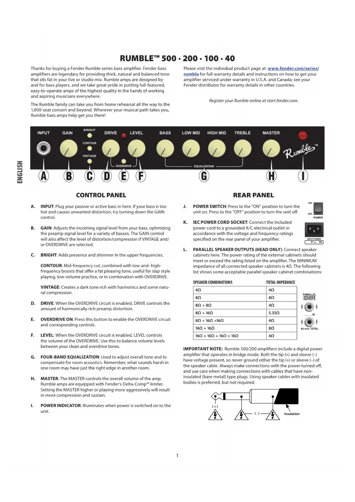 INSTRUKCJA OBSŁUGI | NÁVOD K POUŽITÍ NÁVOD NA POUŽITIE | UPORABNIŠKI PRIROČNIK BASS AMPLIFIER RUMBLE 500 COMBO AND HEAD (V3) RUMBLE 200 COMBO AND HEAD (V3) RUMBLE 100 (V3) RUMBLE 40 (V3)Thanks for buying a Fender Rumble series bass amplifier. Fender bass amplifiers are legendary for providing thick, natural and balanced tone that sits fat in your live or studio mix. Rumble amps are designed by and for bass players, and we take great pride in putting full-featured, easy-to-operate amps of the highest quality in the hands of working and aspiring musicians everywhere. The Rumble family can take you from home rehearsal all the way to the 1,000-seat concert and beyond. Wherever your musical path takes you, Rumble bass amps help get you there! Please visit the individual product page at: www.fender.com/series/ rumble for full warranty details and instructions on how to get your amplifier serviced under warranty in U.S.A. and Canada; see your Fender distributor for warranty details in other countries. Register your Rumble online at start.fender.com. CONTROL PANEL A. INPUT: Plug your passive or active bass in here. If your bass is too hot and causes unwanted distortion, try turning down the GAIN control. B. GAIN: Adjusts the incoming signal level from your bass, optimizing the preamp signal level for a variety of basses. The GAIN control will also affect the level of distortion/compression if VINTAGE and/ or OVERDRIVE are selected. C. BRIGHT: Adds presence and shimmer in the upper frequencies. CONTOUR: Mid-frequency cut, combined with low-and- high- frequency boosts that oer a fat pleasing tone, useful for slap style playing, low-volume practice, or in combination with OVERDRIVE. VINTAGE: Creates a dark tone rich with harmonics and some natu- ral compression. D. DRIVE: When the OVERDRIVE circuit is enabled, DRIVE controls the amount of harmonically rich preamp distortion. E. OVERDRIVE ON: Press this button to enable the OVERDRIVE circuit and corresponding controls. F. LEVEL: When the OVERDRIVE circuit is enabled, LEVEL controls the volume of the OVERDRIVE. Use this to balance volume levels between your clean and overdrive tones. G. FOUR-BAND EQUALIZATION: Used to adjust overall tone and to compensate for room acoustics. Remember, what sounds harsh in one room may have just the right edge in another room. H. MASTER: The MASTER controls the overall volume of the amp. Rumble amps are equipped with Fender's Delta-Comp™ limiter. Setting the MASTER higher or playing more aggressively will result in more compression and sustain.