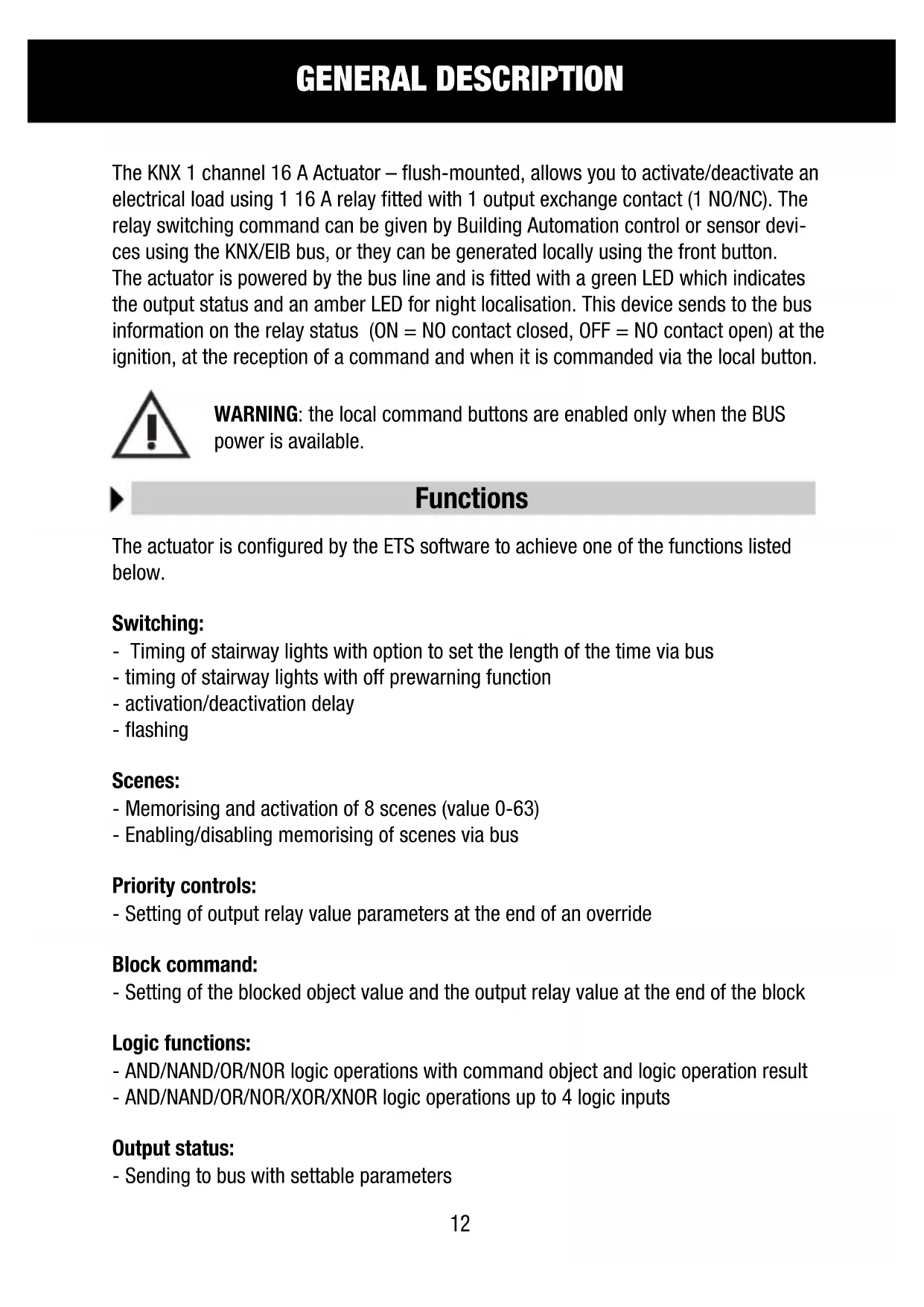 The KNX 1 channel 16 A Actuator - flush-mounted, allows you to activate/deactivate an electrical load using 1 16 A relay fitted with 1 output exchange contact (1 NO/NC). The relay switching command can be given by Building Automation control or sensor devices using the KNX/EIB bus, or they can be generated locally using the front button. The actuator is powered by the bus line and is fitted with a green LED which indicates the output status and an amber LED for night localisation. This device sends to the bus information on the relay status (ON = NO contact closed, 0FF = NO contact open) at the ignition, at the reception of a command and when it is commanded via the local button.